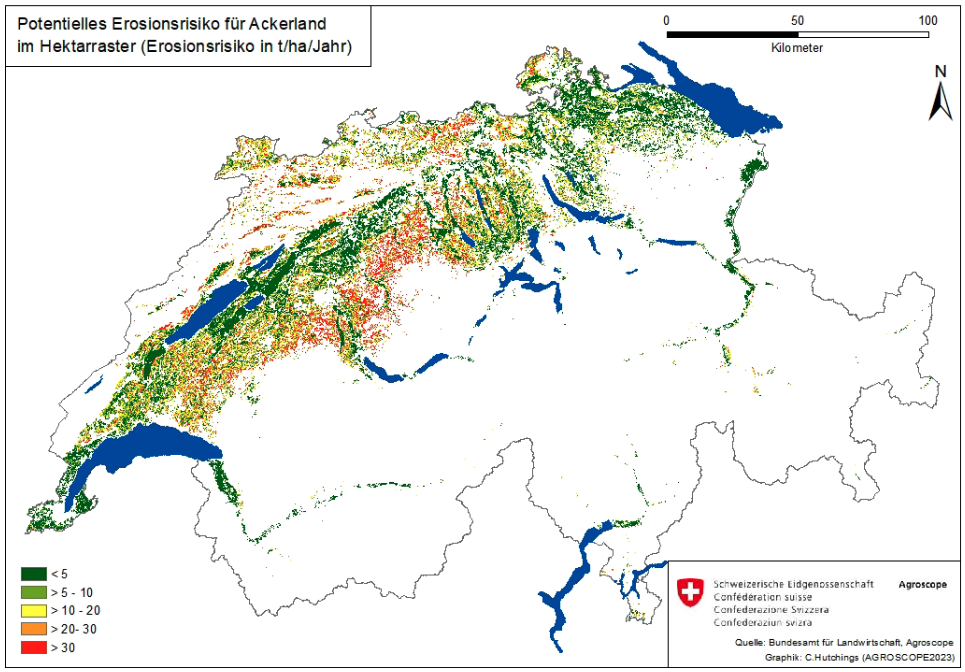 Gemessen am C-Faktor besteht in der Schweiz ein klar kleineres Risiko für Erosion im Ackerbaugebiet: Im Durchschnitt liegt der Wert laut den Studienautoren hierzulande bei 0,1 (inklusive Freilandgemüse) bzw. 0.093 (ohne Freilandgemüse). Dies gegenüber Deutschland mit einem mittleren C-Faktor von 0,124 (berechnet ohne das stärker erosionsgefährdete Freilandgemüse). Die Unterschiede führt man bei Agroscope auf den hohen Anteil Kunstwiese in der Fruchtfolge zurück, der in der Schweiz 32 Prozent beträgt. Ausserdem sei der Anteil mit konservierenden Bodenbearbeitungs-Verfahren bewirtschafteter Ackerflächen hierzulande mit 18 Prozent relativ gross.