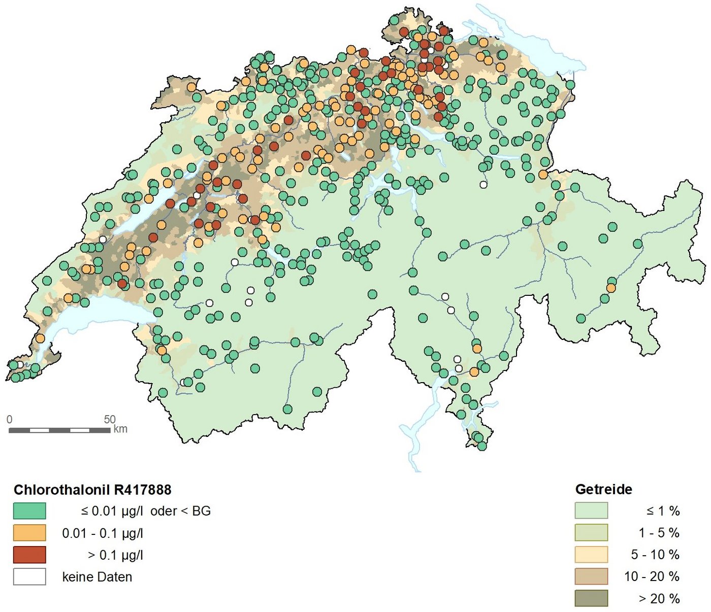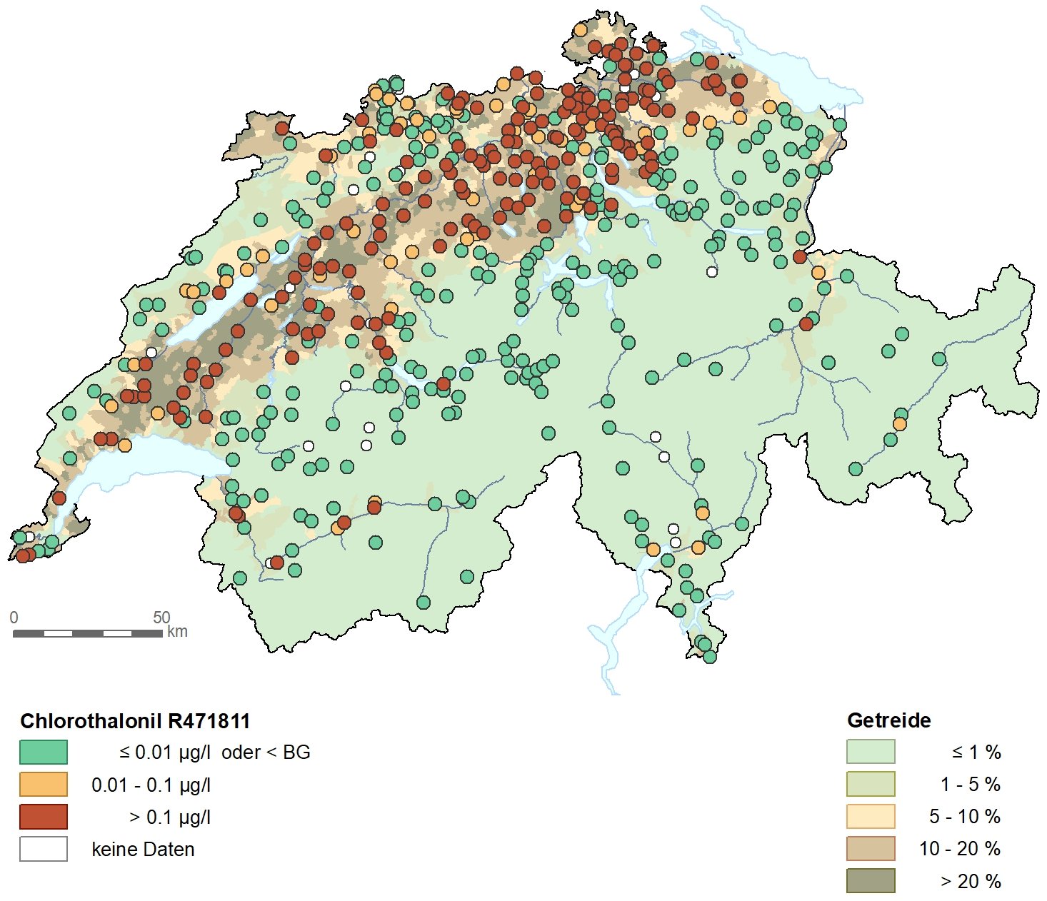 Das Bild hat sich im vergangenen Jahr kaum verändert, bis auf die grössere Datenmenge. Primär R417888 und R471811 verunreinigen laut Bafu das Grundwasser insbesondere in vielen landwirtschaftlich genutzten Gebieten im Mittelland. Werte über 0,1 Mikrogramm pro Liter weisen die Kantone Aargau, Bern, Freiburg, Genf, Graubünden, Jura, Luzern, Neuenburg, St. Gallen, Schaffhausen, Solothurn, Thurgau, Waadt, Wallis, Zug und Zürich auf. Auch zwei weitere Metaboliten seien in erhöhten Konzentrationen gefunden worden, allerdings weniger oft.