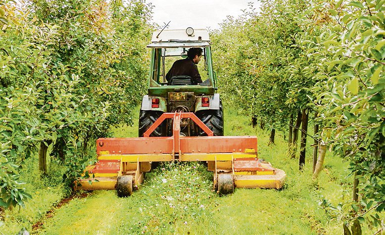2. Mulchen: Erfolgt zwischen Mitte Mai und Ende Juni, zwei bis sechs Wochen nach der Hauptblüte der ersten Blühstreifenpflanzen und der Obstbaumblüte. Die Lichtverhältnisse werden verbessert und die Dominanz der Gräser reduziert. Nicht während der Hauptaktivitätszeit der wichtigsten Nützlinge mulchen.