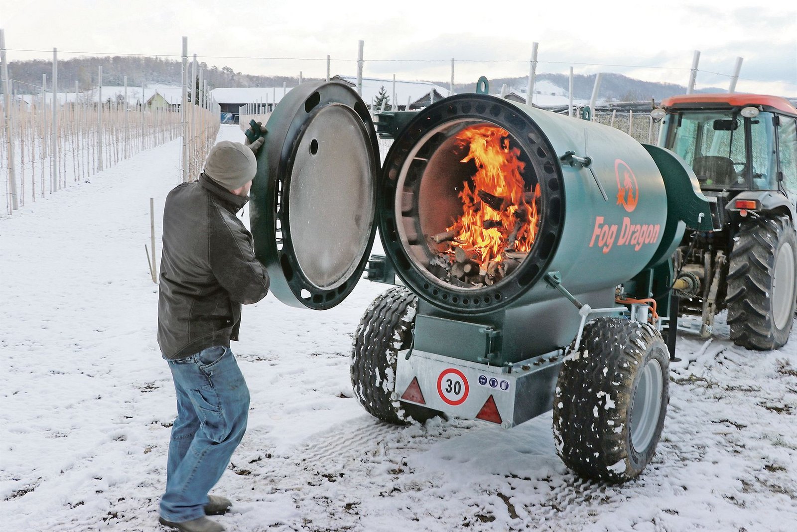 Die Minustemperaturen verschafften den Obstproduzenten in den vergangenen Tagen unruhige Nächte. Andreas Suter vom Loorhof im aargauischen Lupfig blieb gelassener als auch schon: Er startete erstmals seinen «Fog Dragon» zur Frostbekämpfung. Am frühen Morgen befüllte er die Maschine mit Wasser und zündete das Holz im Brennkessel an. Mit einigen Verzögerungen, bis alles richtig eingestellt war – viel Erfahrung gibt es…