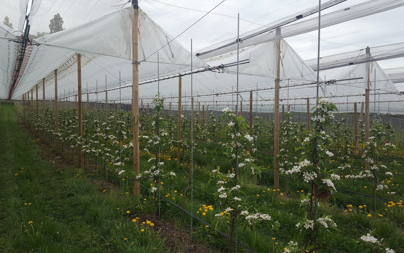 Im Gegensatz zu Kirschen ist in Apfelanlagen die Überdachung mit Regenschutzfolien nicht üblich. Im Rahmen des Interreg-V-Projekts «Modellanlagen für den Integrierten Pflanzenschutz» untersuchte Agroscope in den letzten Jahren in einer Anlage in Wädenswil, ob mit einer solchen Anlage Pflanzenschutzmittel reduziert werden könnten, ohne dass die Äpfel Qualitätseinbussen erleiden. In der Zeitschrift «Obst- und Weinbau» präsentierte Julia Sullmann, die am Projekt beteiligt ist, kürzlich die Resultate. Sie zeigen: Ja, es ist möglich, aber noch nicht praxistauglich, da höhere Zusatzkosten entstehen. Neu werden deshalb weitere, kostengünstigere Möglichkeiten getestet.