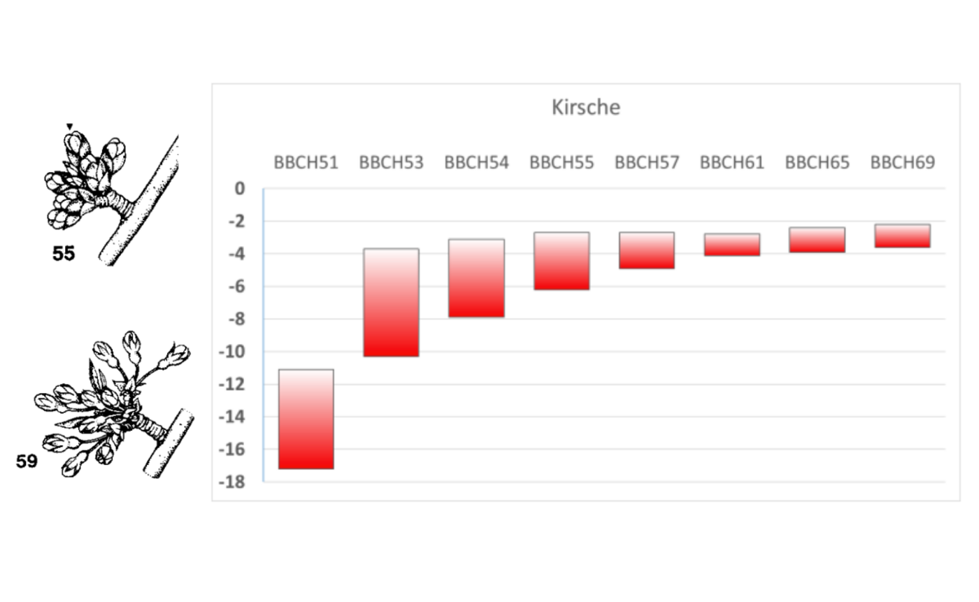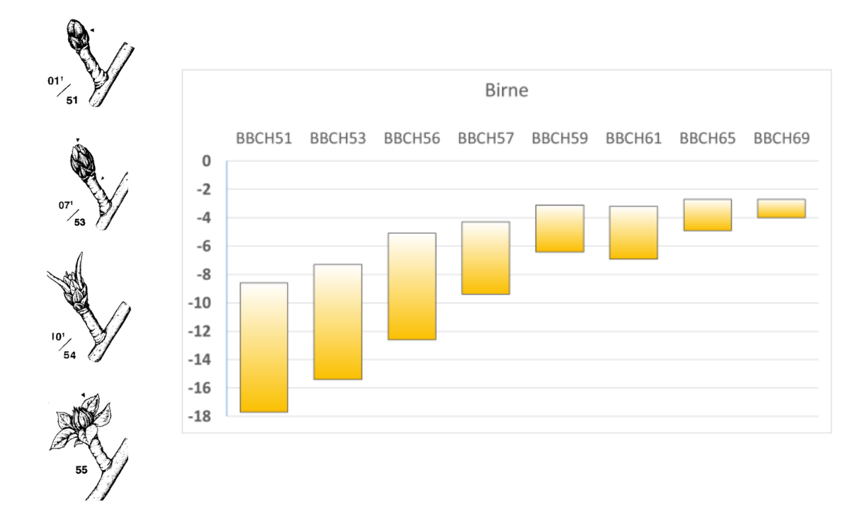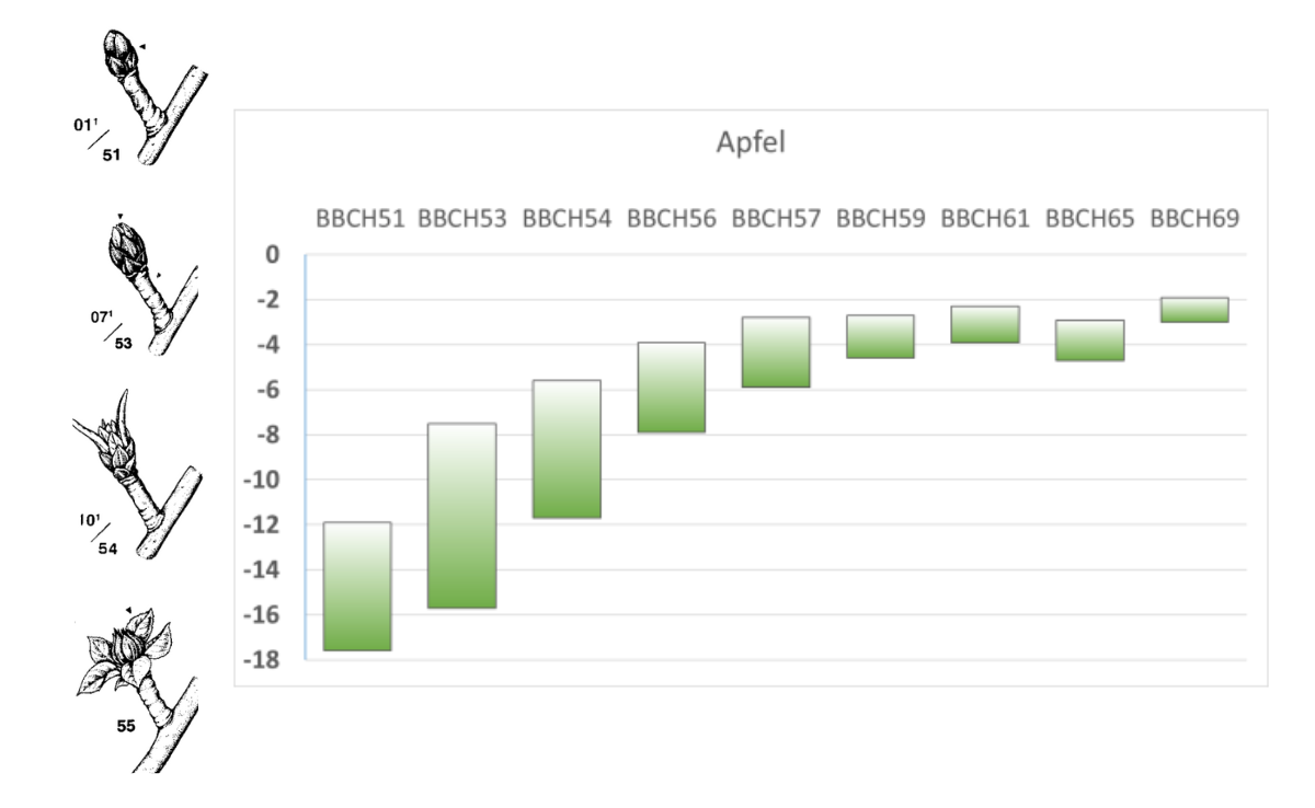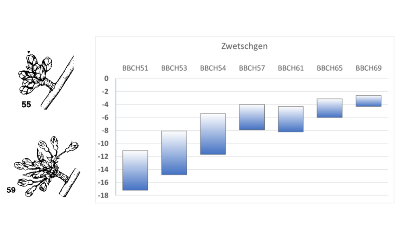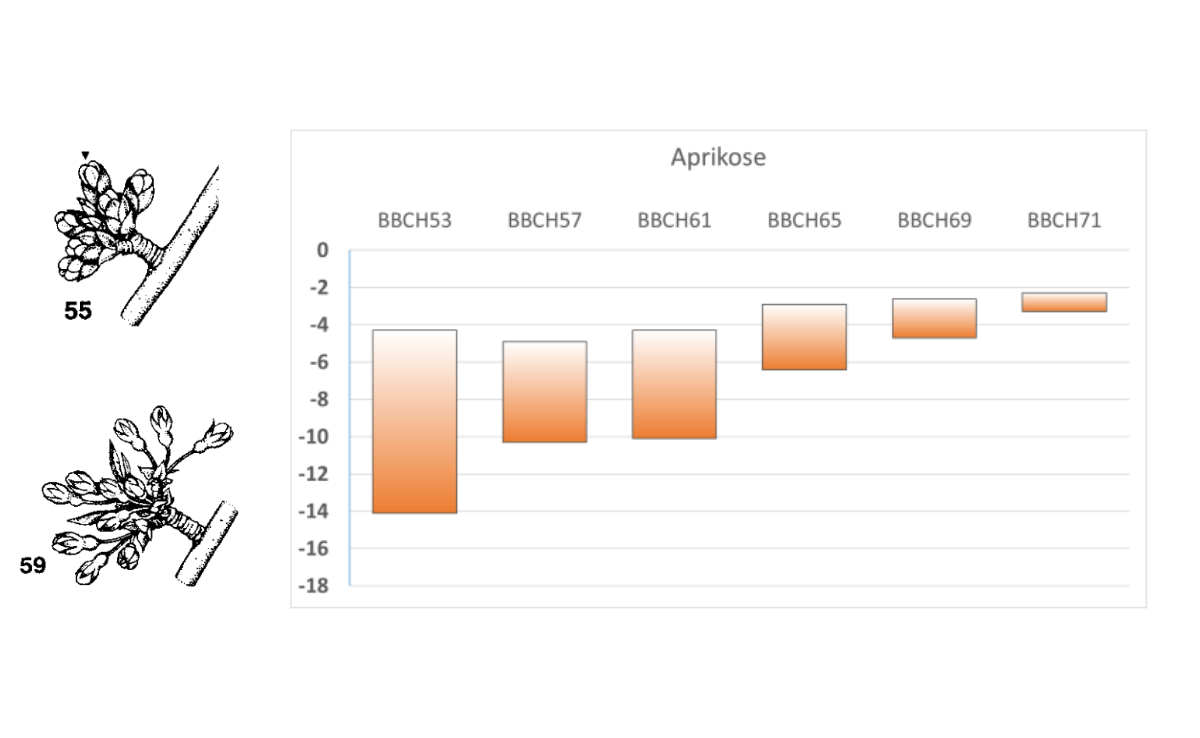 Apfelbäume zeigen sich noch kaum im Blütenkleid, Aprikosen und Pfirsiche hingegen blühen zum Teil. Die unten stehenden Grafiken zeigen die Empfindlichkeit gegenüber tiefen Temperaturen verschiedener Entwicklungsstadien je nach Obstart.