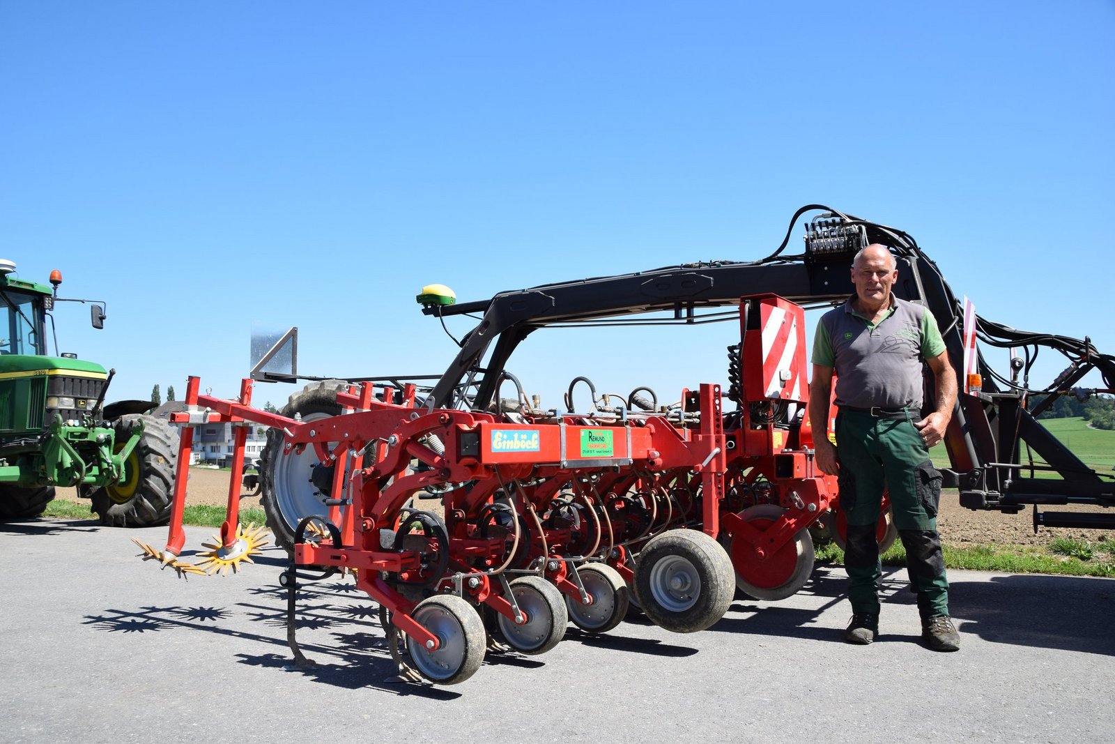 [IMG 13] Wie ein Koloss steht ein glänzender John Deere 6120M auf dem Vorplatz des Lohnunternehmens Schneeberger und Berger in Oberbottigen BE. Danebenstehend trifft man auf Ruedi Emch, der Tüftler hinter dem angehängten Trägerwerk. Schwarzes Maschinenfett verziert die von harter Arbeit gezeichneten Hände des Landwirts, der zu einem häufigen Problem eine Lösung gefunden hat. Präzises Hacken in Hanglagen Das Hacken…