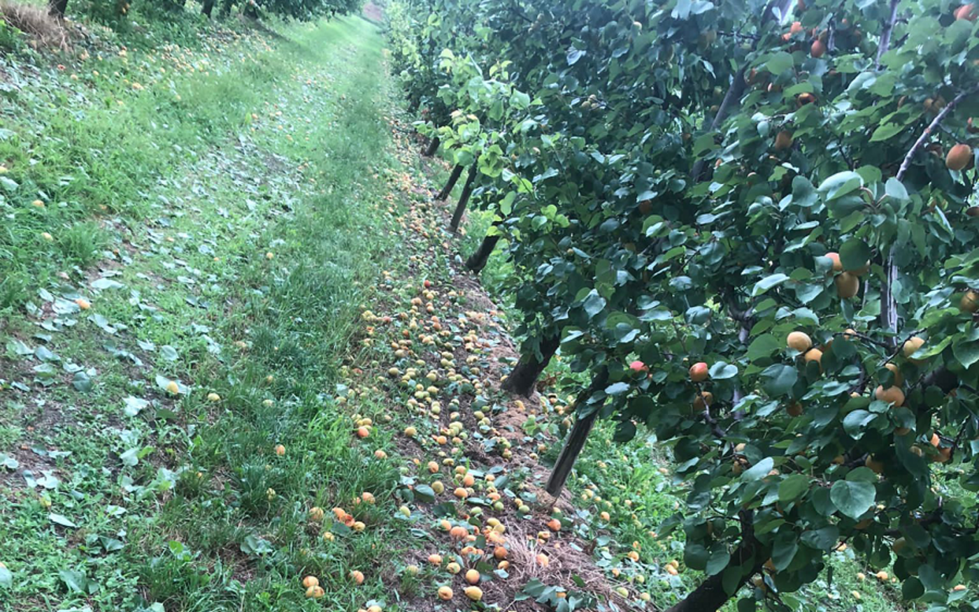 - Für den Obst- und Gemüsesektor sind die Schäden erheblich. Reifes oder kurz vor der Reife stehendes Obst, wie Aprikosen, Pflaumen und frühe Apfelsorten, ist generell stark betroffen.