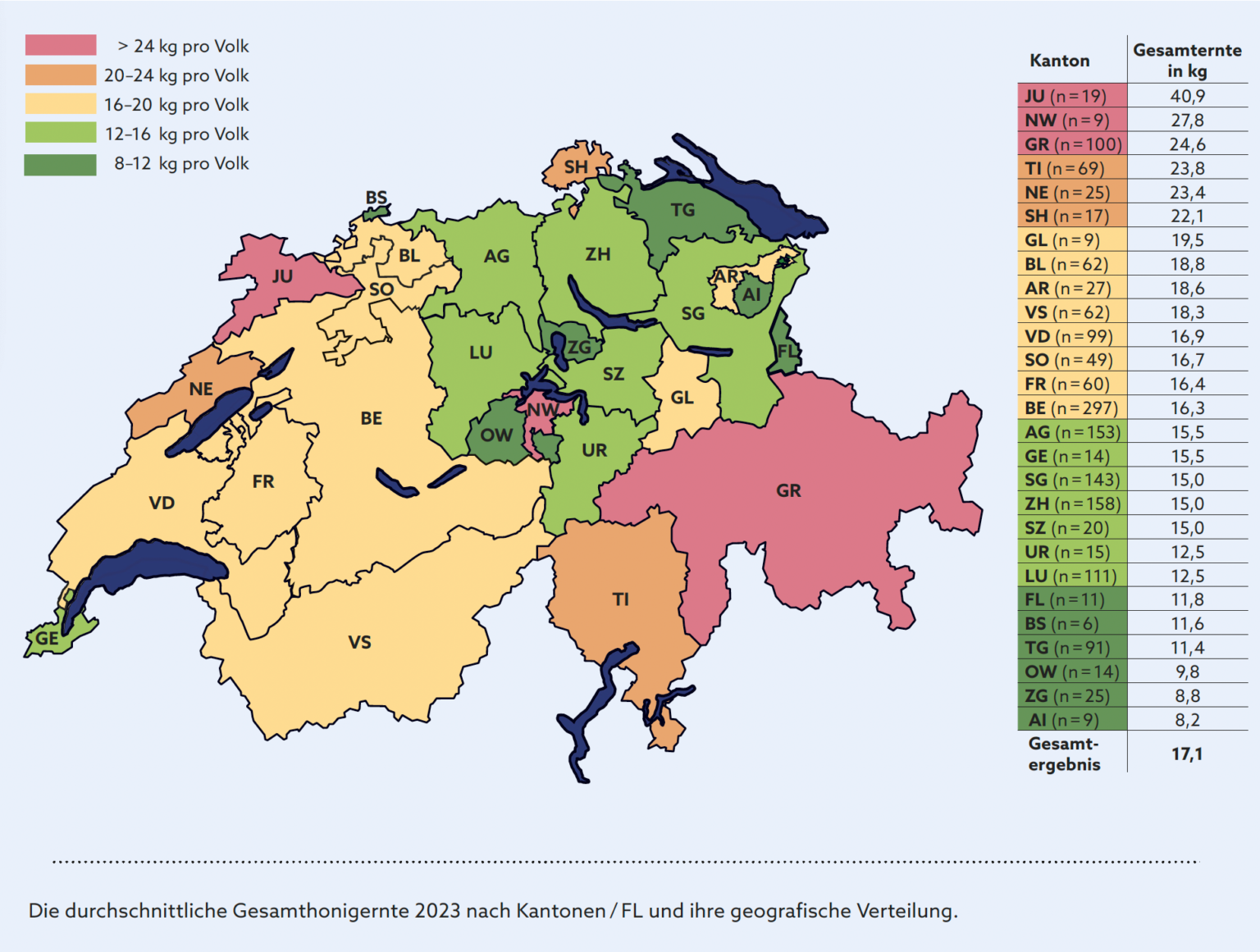 Die warme Witterung des langen Sommers habe die Honigbilanz mit der Sommerernte jedoch deutlich verbessert. Im Durchschnitt seien 11,2 kg pro Volk geerntet worden, was praktisch dem Vorjahreswert (11,5kg) entspreche. Auch die Totalausfälle (kein geernteter Honig pro Volk) haben sich an das Vorjahrjahreniveau (6,9%) angeglichen.