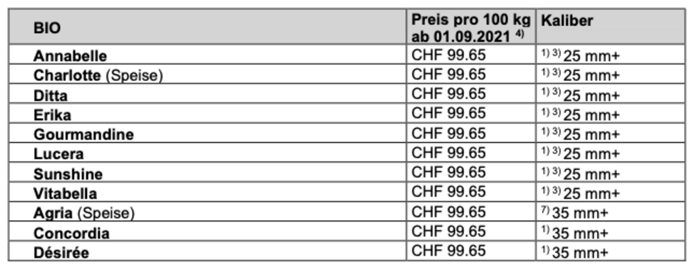 - Bio (mehlig- und festkochen): Fr. 99.65/100 kg
