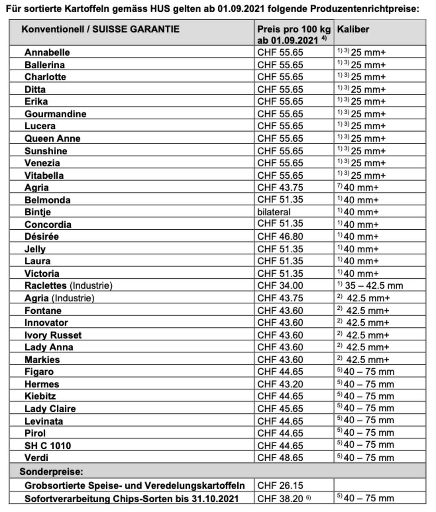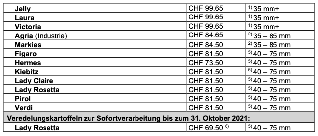 - Chips-Kartoffeln zur Sofortverarbeitung bis am 31. Oktober 2021: Fr. 38.20/100 kg