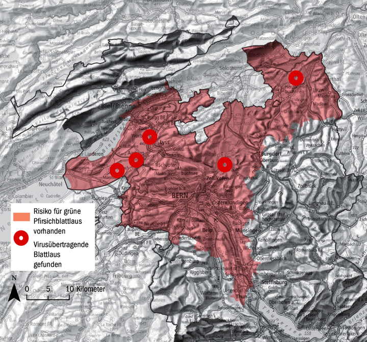 Anfang Woche wurden im Kanton Bern Grüne Pfirsichblattläuse gefunden. Sie sind die Hauptüberträger des Rübenvergilbungsvirus bei Zuckerrüben. In der Gemeinde Urtenen-Schönbühl wurden zwei Blattläuse gefunden, was aufgerundet der Bekämpfungsschwelle entspricht. In der Gemeinde Thunstetten wurde eine gefunden. Dies schreibt die Fachstelle Pflanzenschutz des Kantons Bern. Blattlausdruck und Bodenbefahrkarbeit prüfen «…