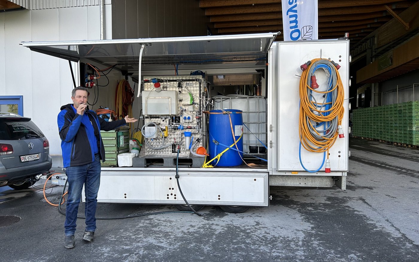 Guggisbergs Skumixanlage ist auf einem Anhänger aufgebaut und sorgt mit zwei Arbeitsplätzen für eine speditive Desinfektion des Gewächshauses. Der betroffene Betrieb muss Strom (32 Amperestecker) und Wasser zur Verfügung stellen. Das Wasser wird über eine Osmoseanlage standardisiert.
