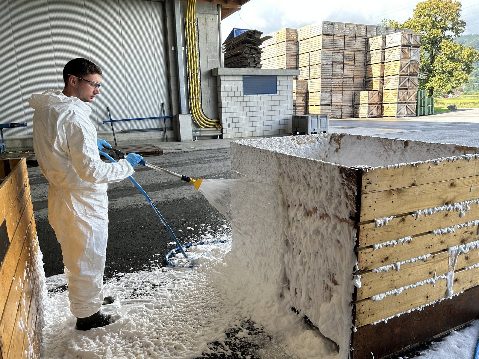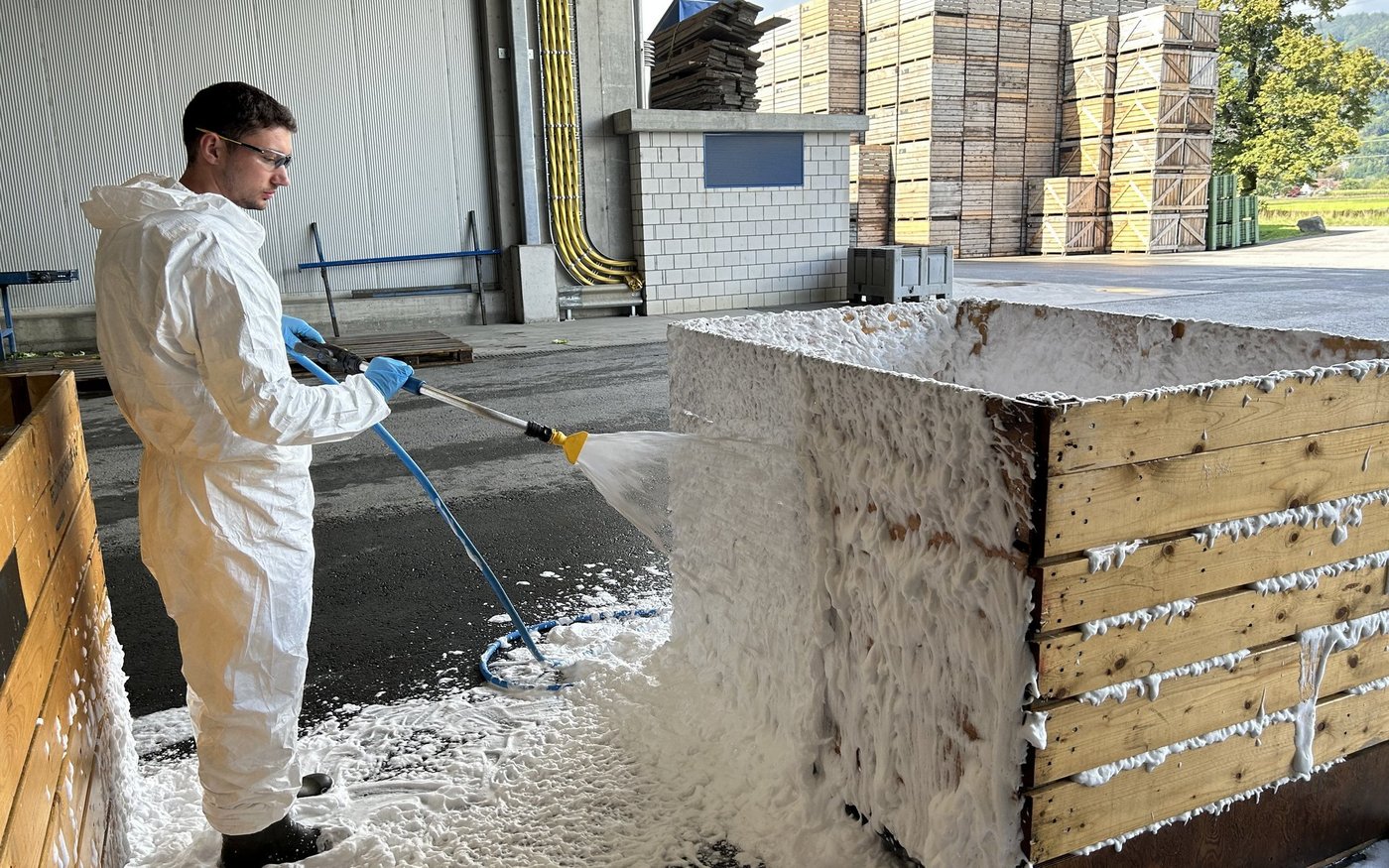 [IMG 4] Mittel und Wirkstoff sind das eine, wichtig für die Bekämpfung ist aber auch die Art der Applikation. In Oberriet zeigte Samuel Guggisberg, Lohnunternehmer aus Zimmerwald BE, wie man den Jordankäfer mittels Schaumapplikation bekämpfen kann. Dafür waren er und sein Mitarbeiter Matthias Schneider mit ihrer mobilen Skumix-Verschäumungsanlage-Anlage angereist. Gegenüber anderen Applikationstechniken wie Vernebeln oder Spritzen sei die Schaumapplikation von Vorteil, hiess es seitens von Menno Chemie an der Tagung. Der Wirkstoff könne gleichmässig verteilt werden, die Kontaktzeit sei länger und eine visuelle Kontrolle sei möglich – zumal die Arbeitssicherheit besser sei, weil es kaum Aerosole gebe.