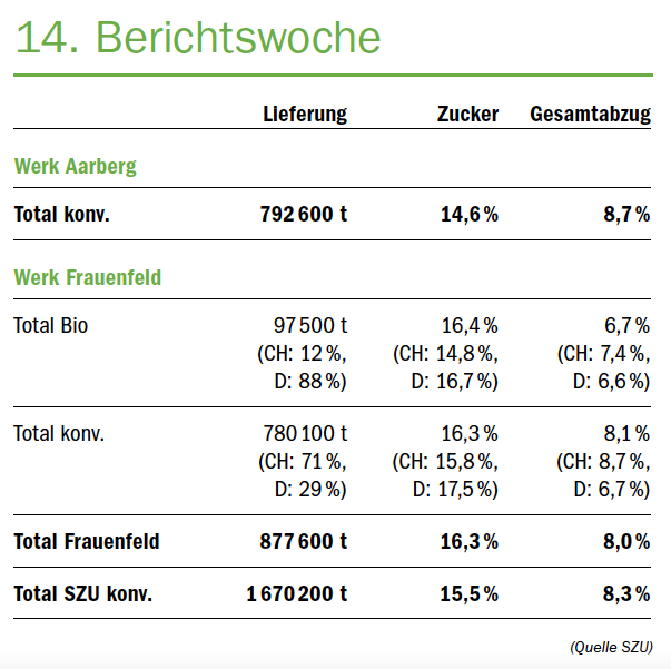 In einer überdurchschnittlich lang andauernden Kampagne wurden schliesslich rund 1,67 Mio Tonnen Rüben verarbeitet, eine Menge, die letztmals 2019 ähnlich hoch war. Daraus könnten zirka 225'000 Tonnen Zucker gewonnen werden. Der durchschnittliche Ertrag bei den konventionellen Rüben Schweiz liegt bei zirka 86 Tonnen Rüben und 15,1 % Zuckergehalt beziehungsweise einem bereinigten Zuckerertrag von 11,3 Tonnen pro Hektare. Trotz der tiefen Zuckergehalte würden dennoch durchschnittliche Zuckererträge erreicht, wie letztmals 2019.