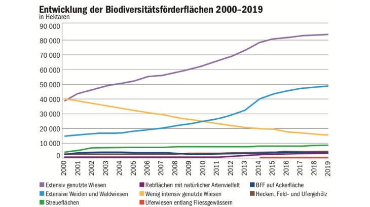 Die Entwicklung der Biodiversitätsflächen in der Schweiz zeigt ein klares Bild. Während die extensiv genutzten Flächen seit dem Jahr 2000 wachsen, nimmt die Anzahl wenig intensiv genutzter Wiesen ab.