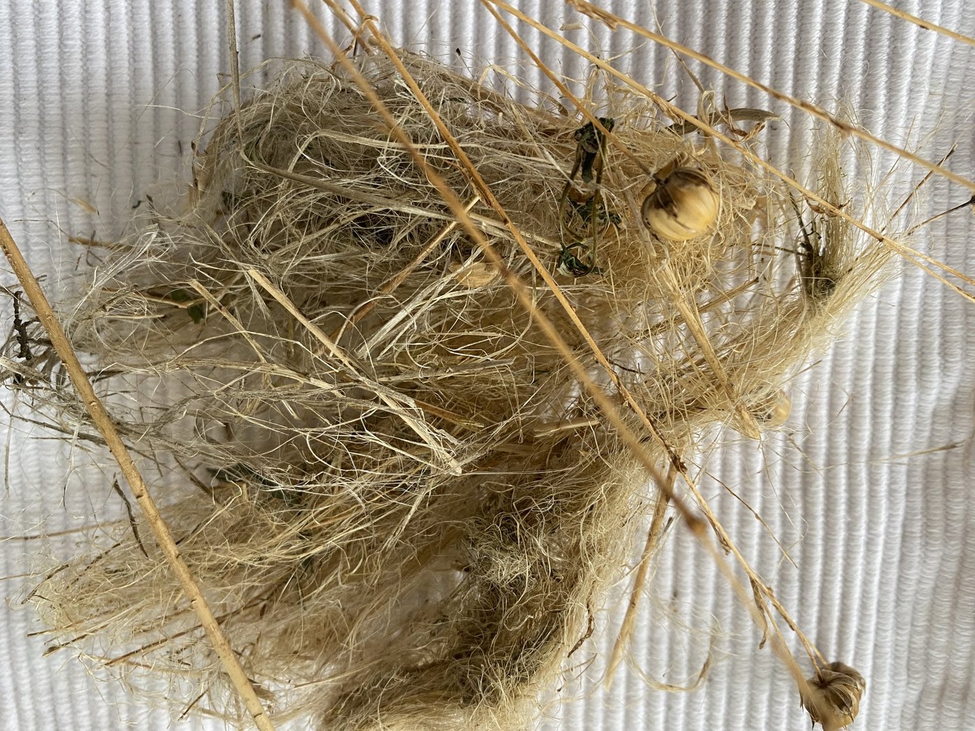 Das Ernteverfahren dagegen ist herausfordernd, weil das Kraut sehr zäh und faserig ist. Die Kapseln direkt zu dreschen ginge grundsätzlich. Jedoch zeigt die Erfahrung, dass sich die Stängel in der Haspel verhaken.