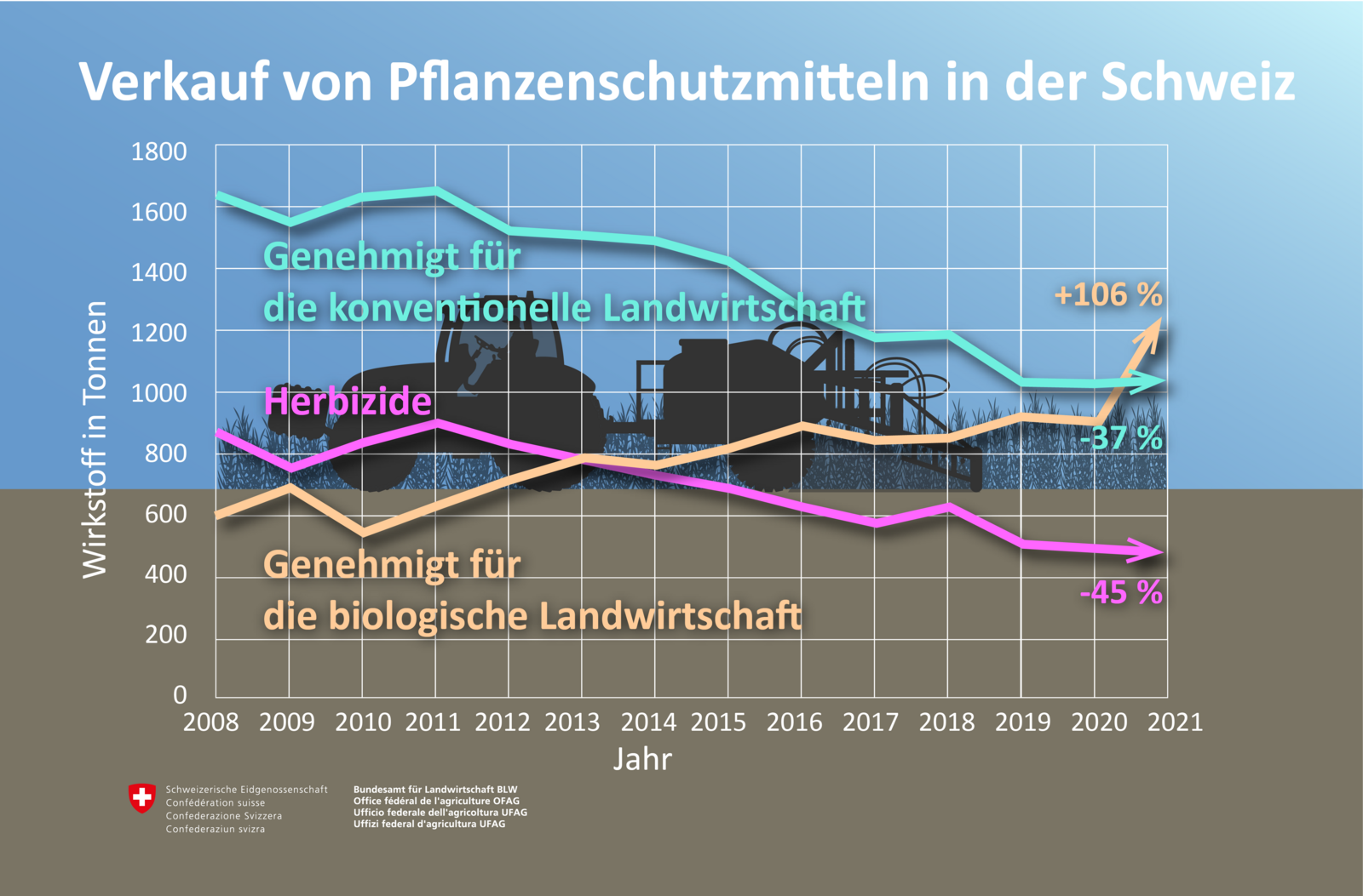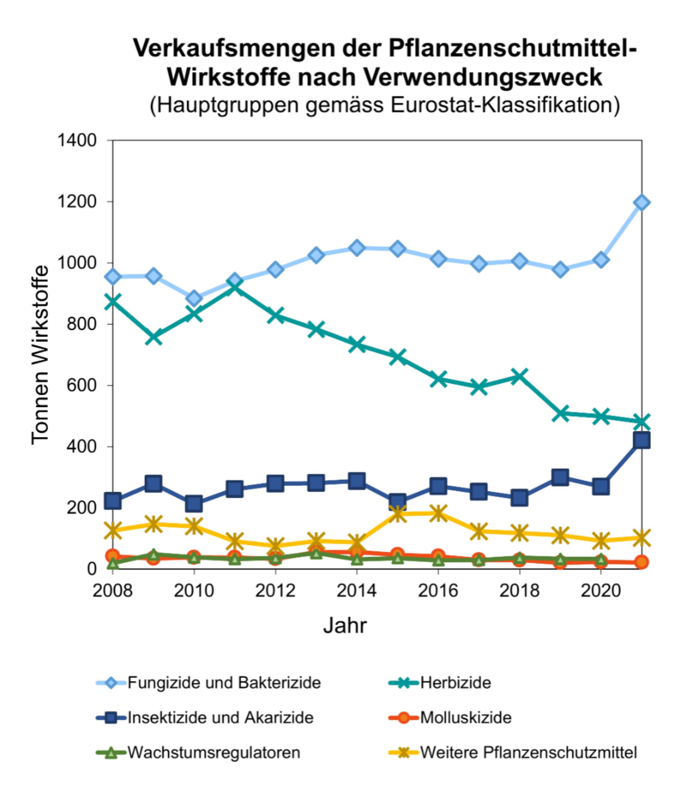 Bei den Fungiziden lässt sich im Vergleich zum Vorjahr ein Anstieg der Verkaufsmengen um 187 Tonnen feststellen; davon wurden Schwefel, Kupfer und Kaliumbicarbonat insgesamt 170 Tonnen mehr verkauft. Bei den Insektiziden wurde eine Zunahme beim Paraffinöl verzeichnet (+154 t). Dabei handelt es sich um ein Insektizid, das in der Biolandwirtschaft zugelassen ist und als Ersatz für Chlorpyrifos dient, das im Jahr 2020 verboten wurde. Bei den Herbiziden ist hingegen ein erneuter Rückgang der Verkaufsmengen festzustellen (–18 t gegenüber 2020). Im Jahr 2021 wurden insgesamt 2259 Tonnen Pflanzenschutzmittel verkauft.