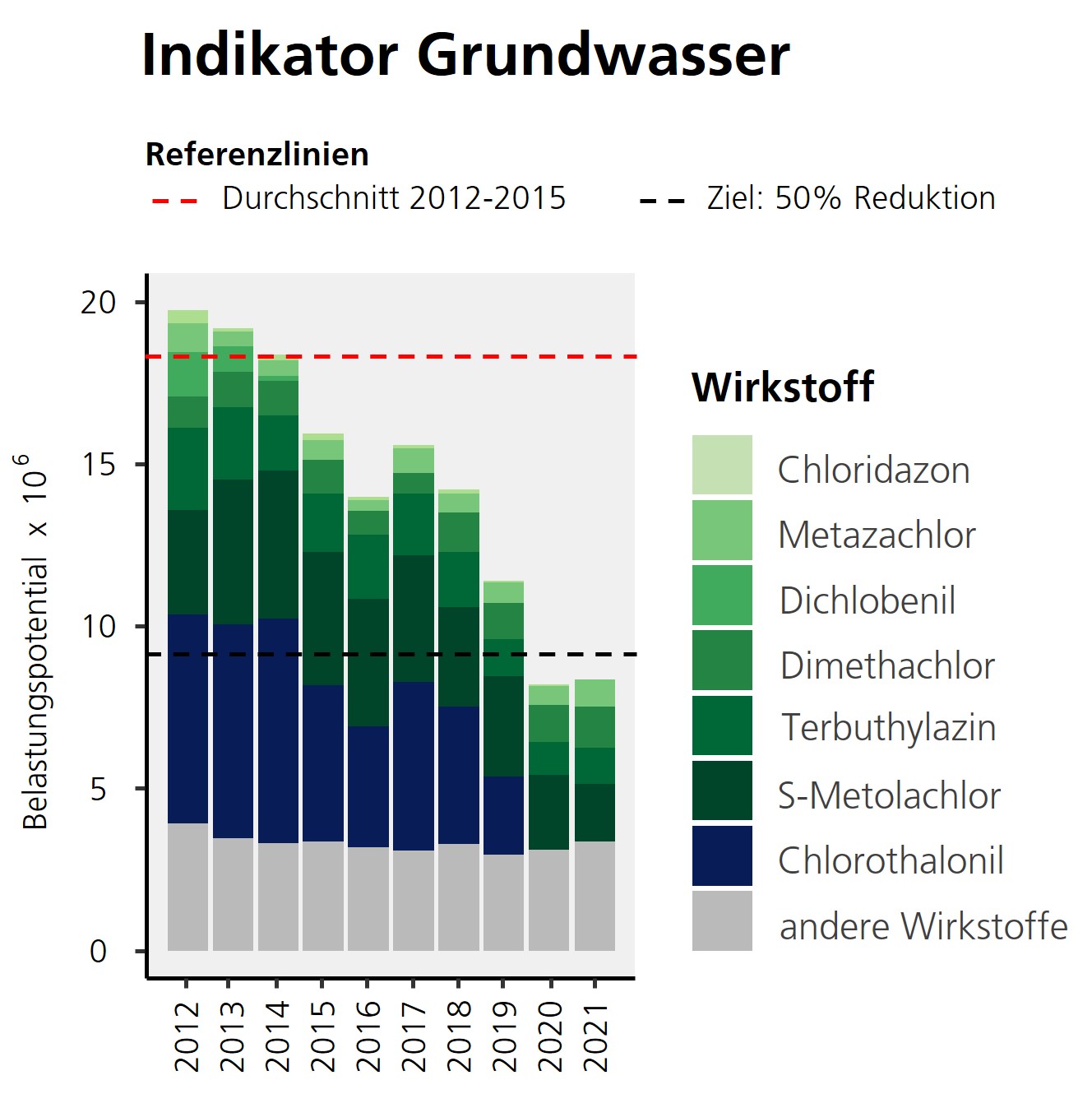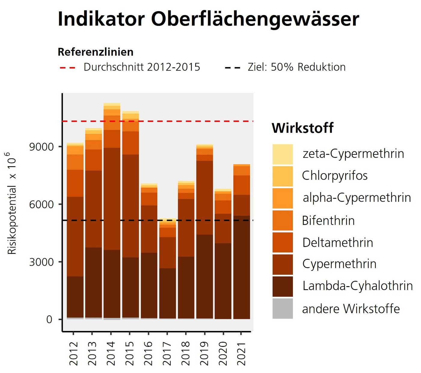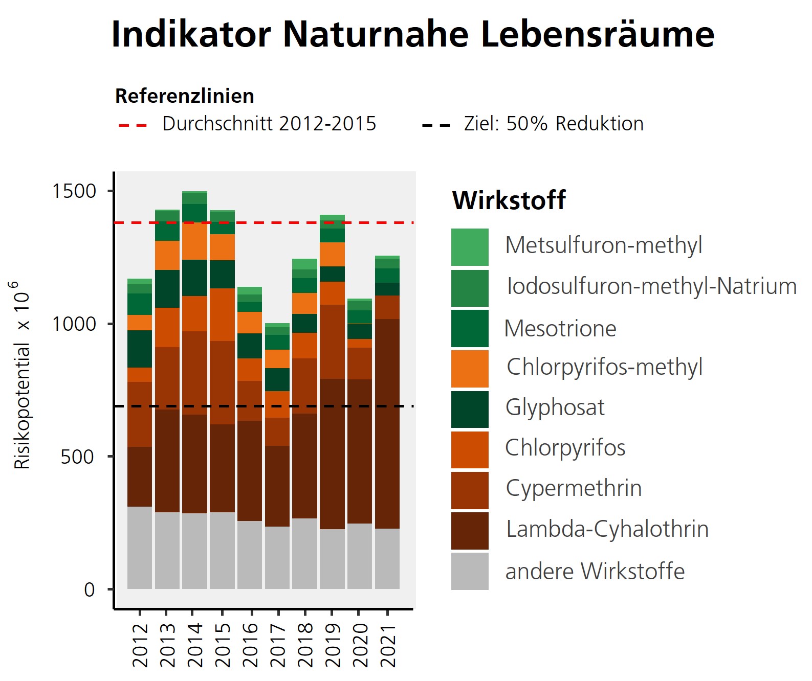 Im Jahr 2021 legte das Parlament das Ziel fest, bis 2027 die mit Pflanzenschutzmitteln verbundenen Risiken für Oberflächengewässer, Grundwasser und naturnahe Lebensräume (z. B. Biotope) um 50 Prozent zu reduzieren. Um diese Risiken berechnen zu können, wurden Indikatoren entwickelt. Sie basieren