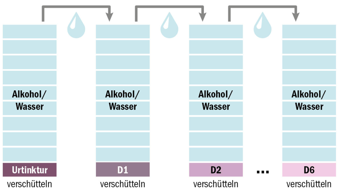 Der Ausgangsstoff Belladonna (Tollkirsche) wurde mit Alkohol oder Wasser 1:10 verdünnt (D). Dies wird sechsmal wiederholt (D6). D. h. aus der ersten Verdünnung wird wieder ein Teil mit neun Teilen Alkohol oder Wasser verdünnt und so weiter (siehe Bild).