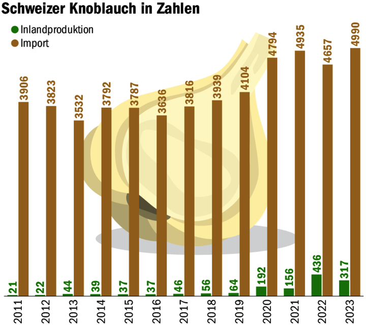 In der Schweiz ist der Anbau von Knoblauch eine Nische. Die Erntemenge hat sich in den letzten Jahren aber stetig gesteigert. 2010 lag die Anbaufläche bei unbedeutenden 1,5 ha – 2023 waren es 47 ha Bio und 19 ha Konventionell.