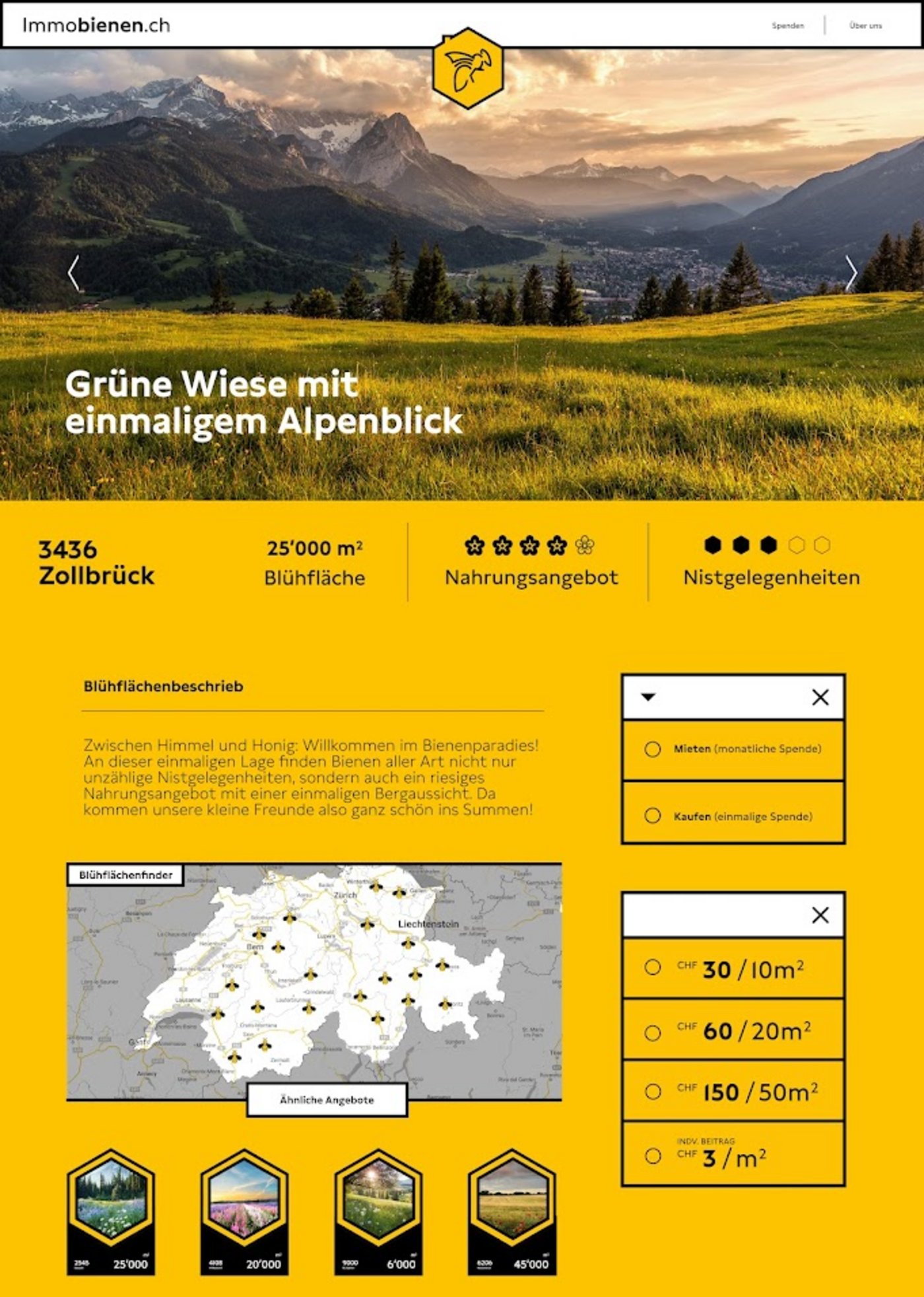 Analog zum Wohnungsmarkt für Menschen kann man auf Immobienen.ch Blühflächen quadratmeterweise kaufen oder mieten. Beim Start der Plattform sind 170 solche «Immobienen» verfügbar – Flächen, die Landwirt(innen) oder auch Gemeinden und Institutionen zum Blühen bringen möchten und die im Zeitraum von August 2023 bis Mitte Mai 2024 angemeldet worden sind. Den Quadratmeter Wiese, Hecke, Brache, Saum oder Blühstreifen gibt es für Spender ab drei Franken.