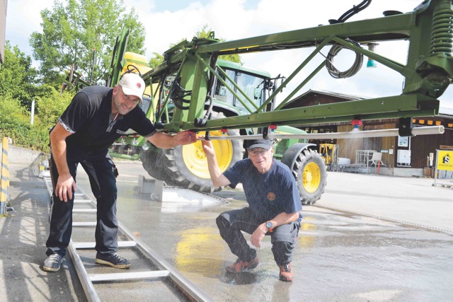 Organisiert vom Bernischer Verband für Landtechnik (BVLT) werden am Dienstag auf der Rütti elf Feldspritzen von Peter Aebi und Peter Gerber kontrolliert. Dabei werden die Düsen, die Pumpe, der Filter, der Druckregler sowie auch die ganze Beleuchtung der Spritzen überprüft.