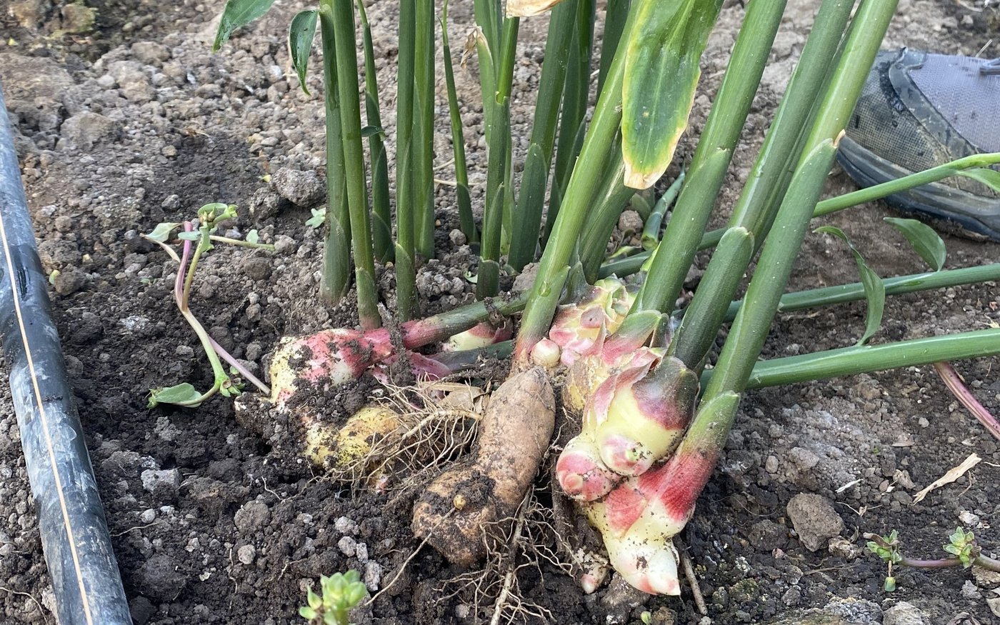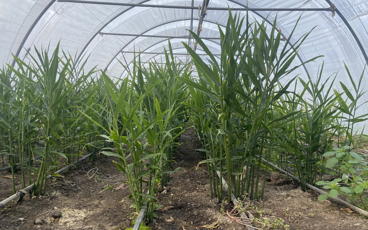 Auf zwölf Aren im Folientunnel wächst der Ingwer in diesem Jahr. Im Vergleich zu den vorigen zwei Jahren passten sie den Anbau nach unten an. Der Grund: Zu Coronazeiten gab es einen regelrechten Run auf die gesunde Knolle, der besondere Heileigenschaften nachgesagt werden. Die Wurzel ist nicht nur eine beliebte Zutat für asiatische Rezepte, auch im Erkältungstee wirkt die Pflanze wohl Wunder. Sie wirke antiviral sowie entzündungshemmend und vertreibe Übelkeit, ist in wissenschaftlichen Studien nachzulesen.