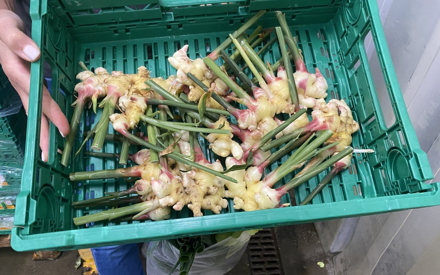 Wie sieht er denn nun aus, der Schweizer Ingwer? Er entwickelt grüne, lang gezogene Blätter ähnlich wie der Mais, nur viel kleiner. Die Pflanze wird aus der Erde gezogen. Die Farbe der Knolle ist bei der Ernte nach fünfmonatiger Vegetation hell- bis leicht rosa. 5 cm oberhalb der Wurzel wird das Grün abgeschnitten, anschliessend mit einem harten Wasserstrahl gewaschen. So landet der Ingwer im Harass. Die Konsumenten kennen den Ingwer aus dem Ausland mit einer festen Schale. Der frische hat keine Schale. Das Aroma ist nicht ganz so scharf. Er ist saftiger und hat keine Fasern.