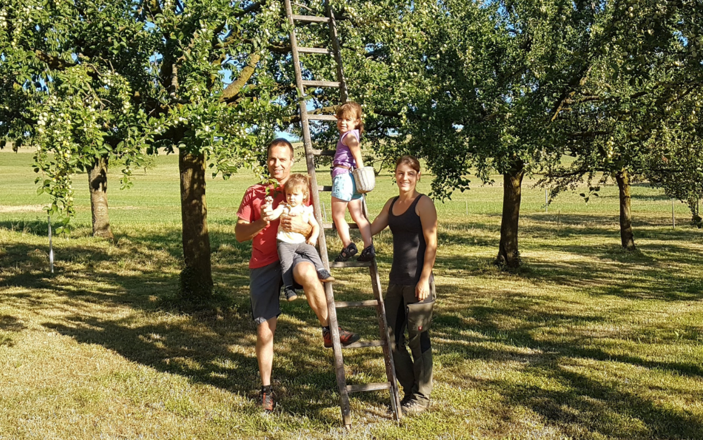 Im Frühling und im Herbst dient die Streuobstwiese mit den Mirabellen-Bäumen als Weide für die Milchkühe der Schwobs. Die Pflanzen seien daran gewöhnt: «Die Wurzeln sind tief und der Tritt des Viehs verursacht keinen Schaden», so die Einschätzung des Betriebsleiters. Für einen Profi-Betrieb wäre das ein No-Go, meint seine Gattin. Schliesslich werden die unteren Zweige abgefressen. «Aber bei uns geht das Milchvieh vor», stellt Myriam Schwob klar. Zum Schutz vor Rehen aus dem nahen Wald tragen die Stämme allerdings ein Zaungitter im unteren Bereich. Die Wildtiere dringen zum Teil bis zu den Rosen im Hausgarten vor.
