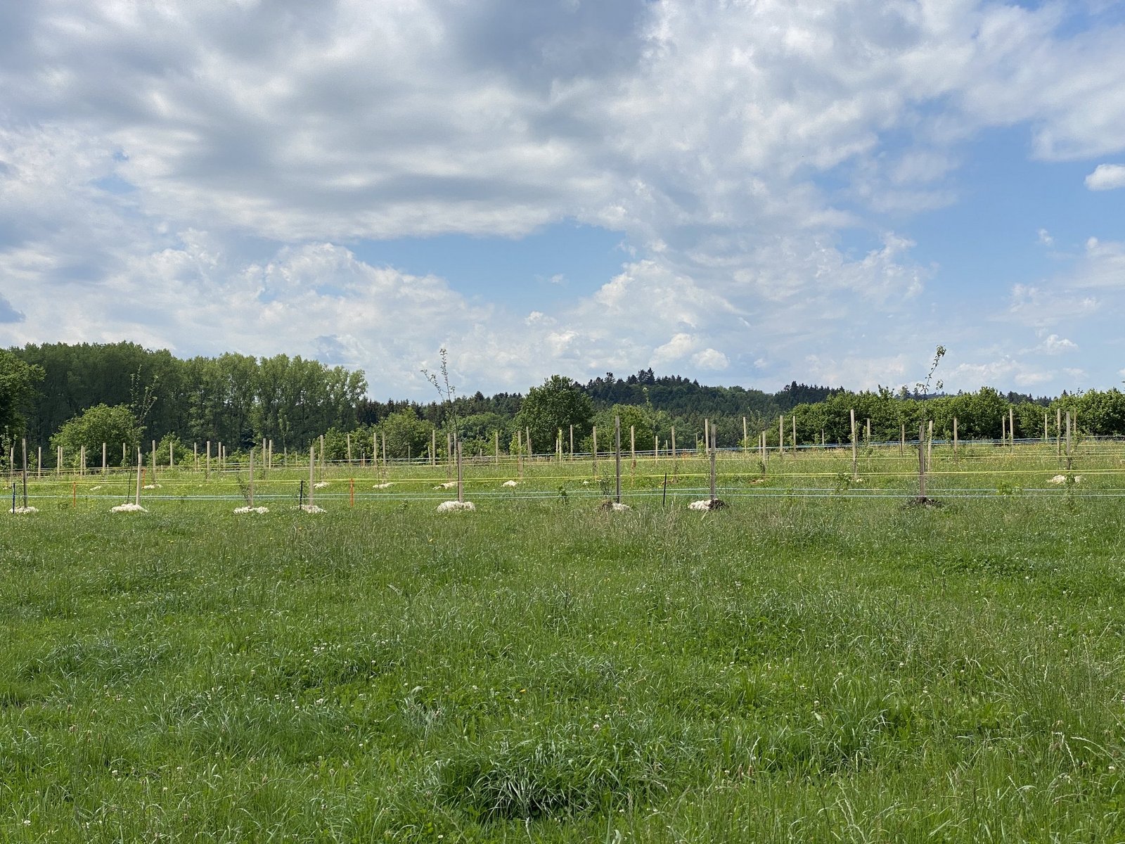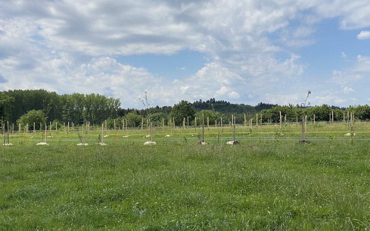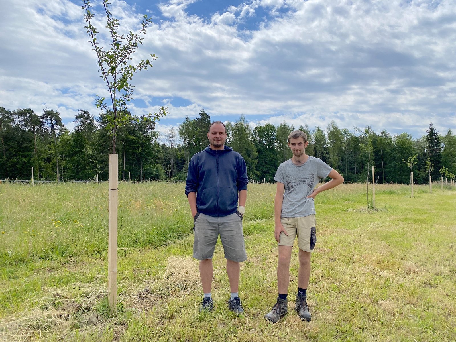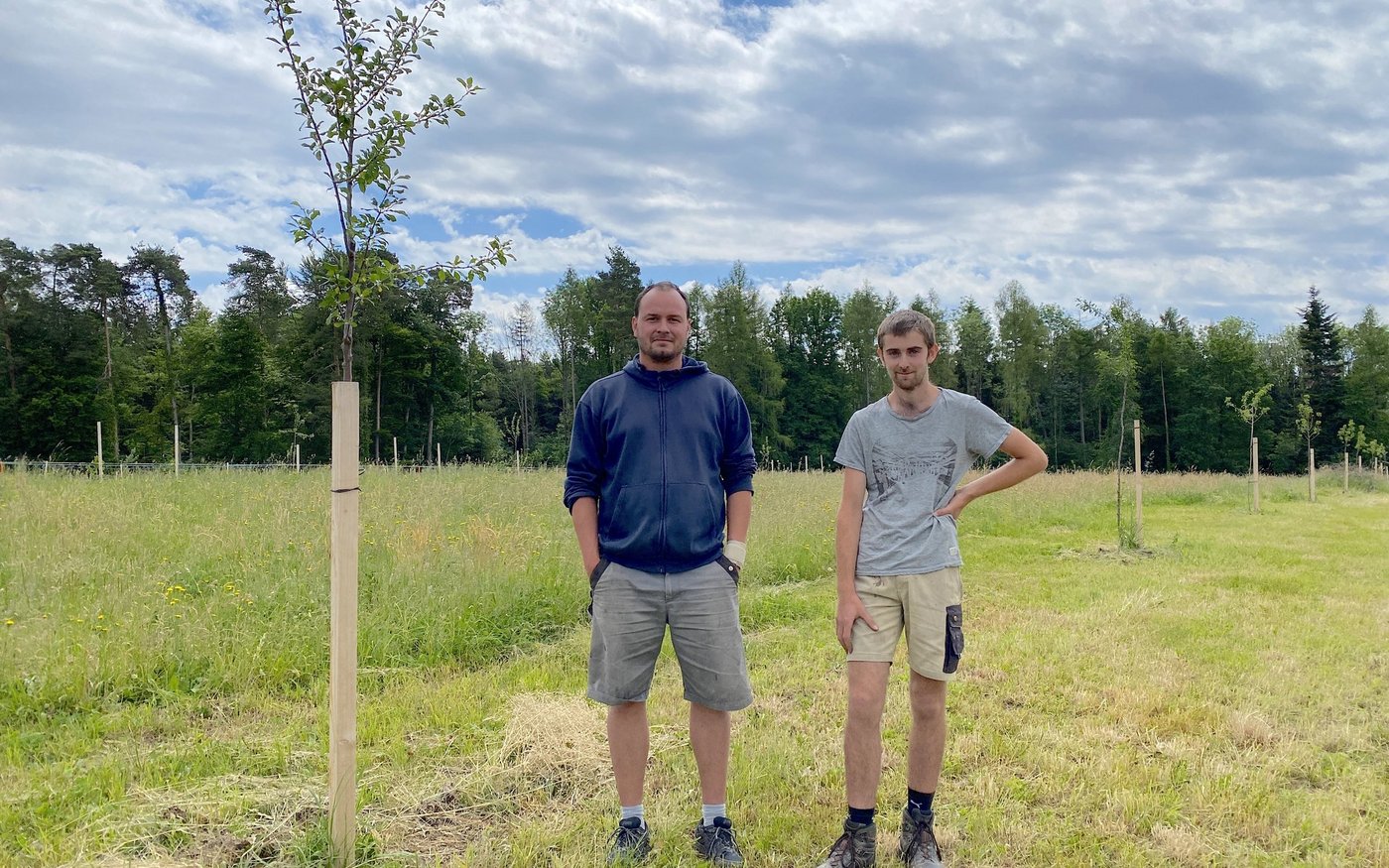«Hier haben wir im letzten November 107 Hochstammbäume, 147 Spindeln und 114 Beerensträucher gepflanzt», schildert Valentin Birbaum. Er steht auf einer drei Hektaren grossen Fläche, die rundherum von einer Q1-Hecke, Biodiversitätsförderfläche, alten Nussbäumen und dem Waldrand begrenzt wird. Auf der ehemaligen Rinderweide wachsen Zwetschgen, Äpfel, Birnen, Kirschen, Kaki, Kastanien, Mirabellen, Pfirsiche, Johannisbeeren, Cassis, Blaubeeren, Sanddorn und mehr. «Es ging auch um die Erhaltung alter Sorten, da arbeiten wir mit Pro Specie Rara zusammen», erläutert Armin Komposch, Vorstandsmitglied von TaPatate. Die Nord-Süd-ausgerichteten Reihen sind so gepflanzt, dass Früchte mit ähnlichen Erntezeitpunkten benachbart wachsen. «So können wir uns durchs Jahr von hinten nach vorne durchernten», erklärt Birbaum die Überlegung.