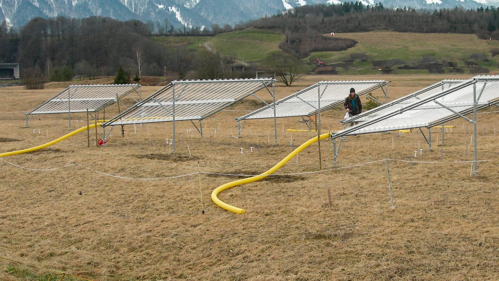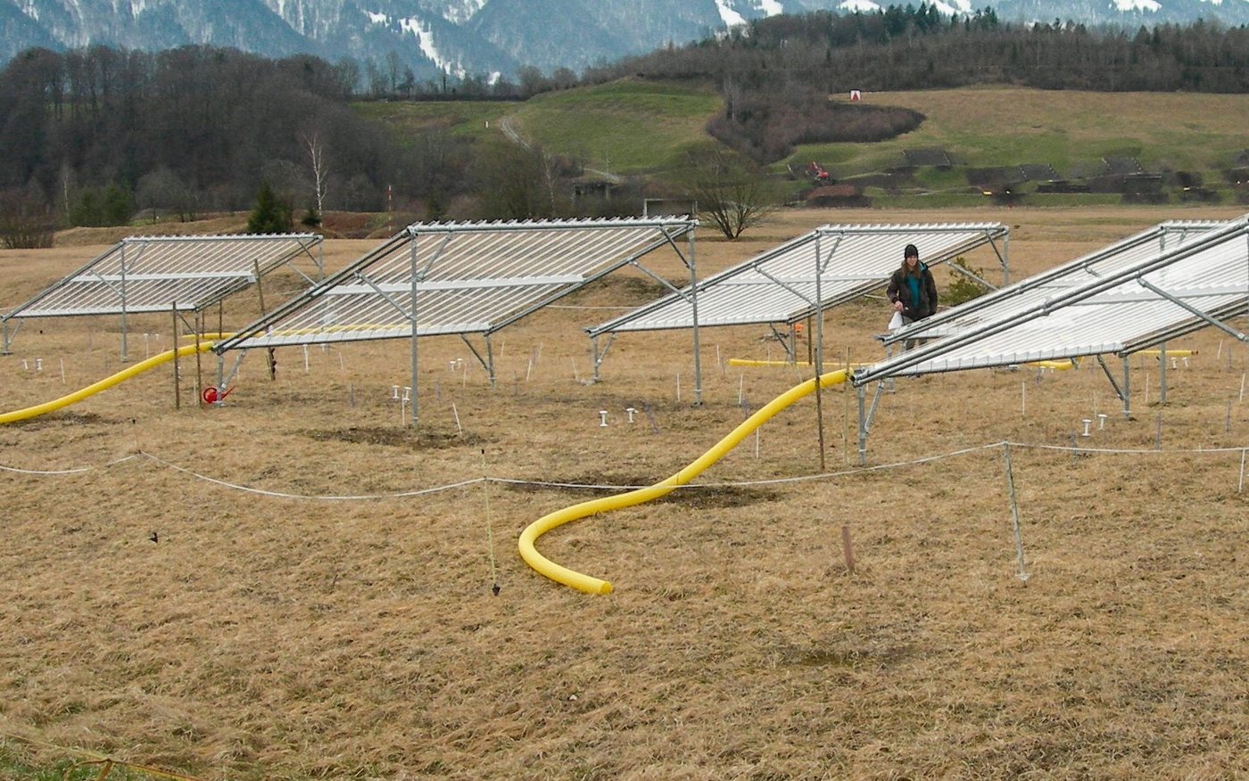 Am Standort Thun führten der Ökologe Andreas Stampfli und die Ökologin Michaela Zeiter von der HAFL ihre Feldexperimente durch. «Von zwölf gleich grossen Wiesenflächen wurden sechs mit Plexiglas-Lamellen überdacht, sodass rund 33 Prozent weniger Regen auf den Boden gelangen konnte als üblich», erklärt Andreas Stampfli den Versuchsaufbau. Damit sei exakt der Jahresniederschlag des trockensten Jahres der letzten hundert Jahre simuliert worden. Vor, während und nach der simulierten Trockenheit seien dabei die Artenzusammensetzung und die Funktion des Ökosystems erfasst worden.