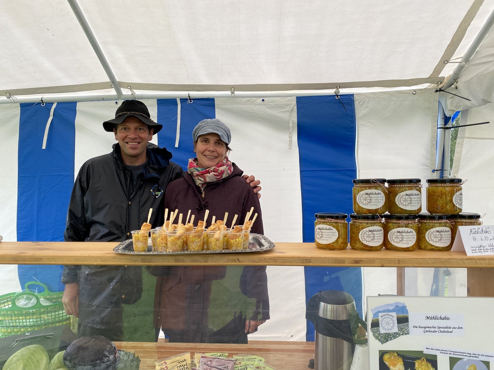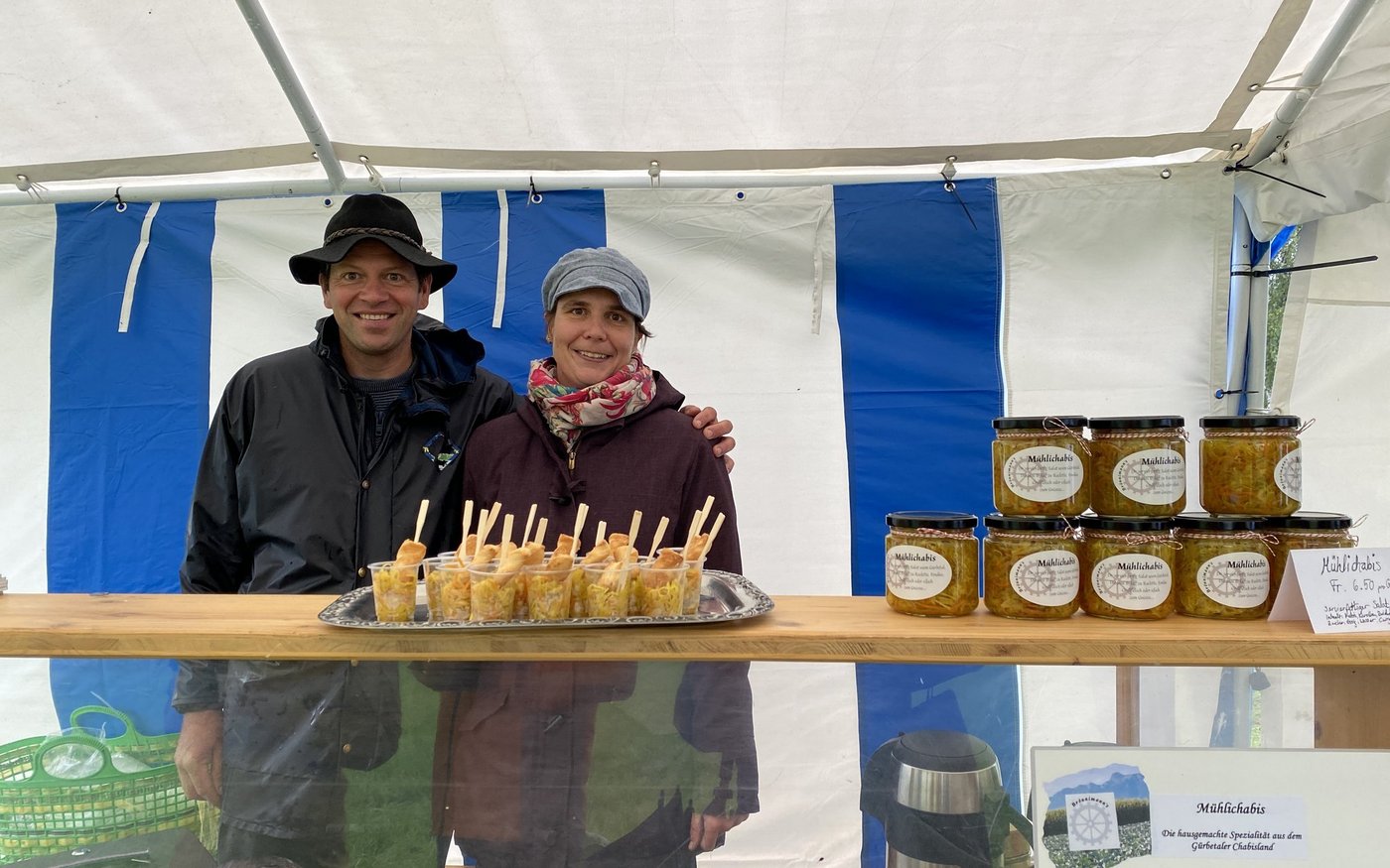 Nach der Betriebsführung fuhren Andreas Aebi und Martin Rufer mit dem Pferdewagen zur Gourmet-Tour entlang der Gürbe, bei der lokale Produkte und Spezialitäten vorgestellt werden. So gab es am Stand von Familie Wenger einen Salat aus Gürbentaler-Quinoa zum Probieren und bei Familie Brönnimann «Mühlichabis», einen hausgemachten Chabis-Salat.