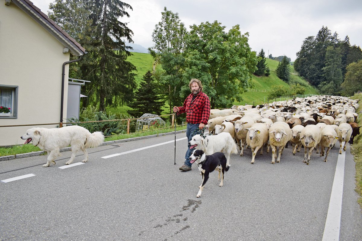 Es sieht aus wie ein gemütlicher Spaziergang. Markus Nyffeler hat einen Border Collie und einen Herdenschutzhund an der Leine, drei weitere Herdenschutzhunde flanieren gemütlich, ein Pfiff und ein weiterer Border flitzt heran. Hinter Nyffeler ergiesst sich ein weissbraunes Meer von Schafen. Der Marsch ist für Tier und Mensch lang Grosse, kleine, solche mit Hörnern, solche ohne. Einige blöken, suchen ihre Lämmer,…