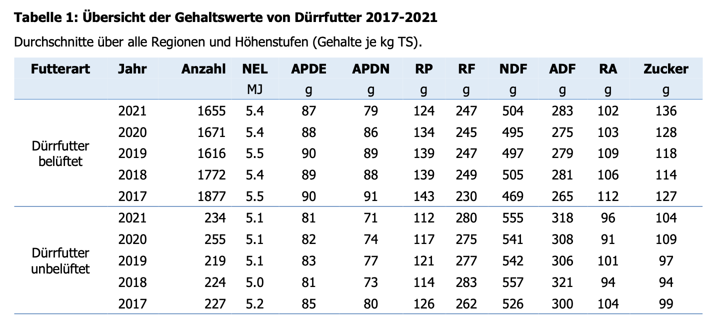 Die Analysegehalte des Dürrfutters 2021 liegen teilweise leicht unter dem Durchschnitt der letzten fünf Jahre, schreibt Agridea weiter: