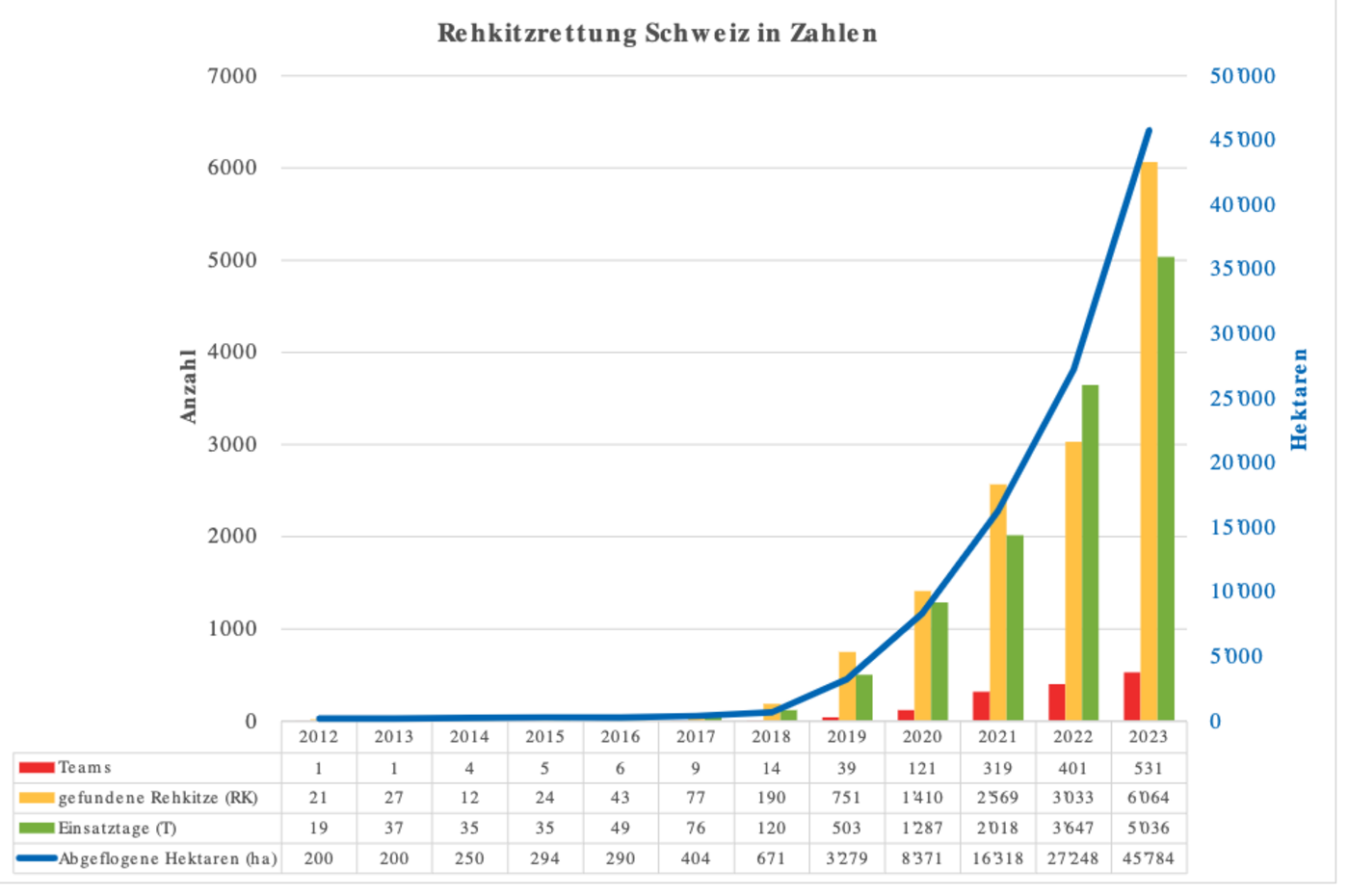 Für die Verdoppelung der Anzahl mit Drohnen geretteter Rehkitze von 2022 auf 2023 nennt der Verein Rehkitzrettung Schweiz mehrere Gründe. So seien ein Drittel mehr Teams im Einsatz gewesen und die Drohnenpilot(innen) flogen jeweils mit 86 statt 68 ha pro Kopf deutlich mehr Wiesland ab als im Vorjahr.