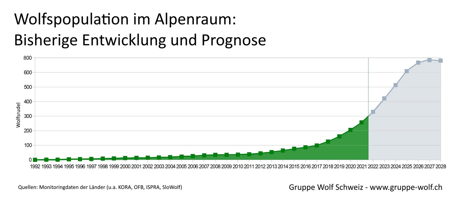 Der Wolfsbestand wächst rasant, im Moment sogar exponentiell, heisst es weiter. Man rechne mit einem jährlichen Zuwachs von 25-30 Prozent, womit 2022 300 Rudel erreicht werden dürften. Bald sei somit die Hälfte der Lebensräume besiedelt, schlussfolgert die GWS.