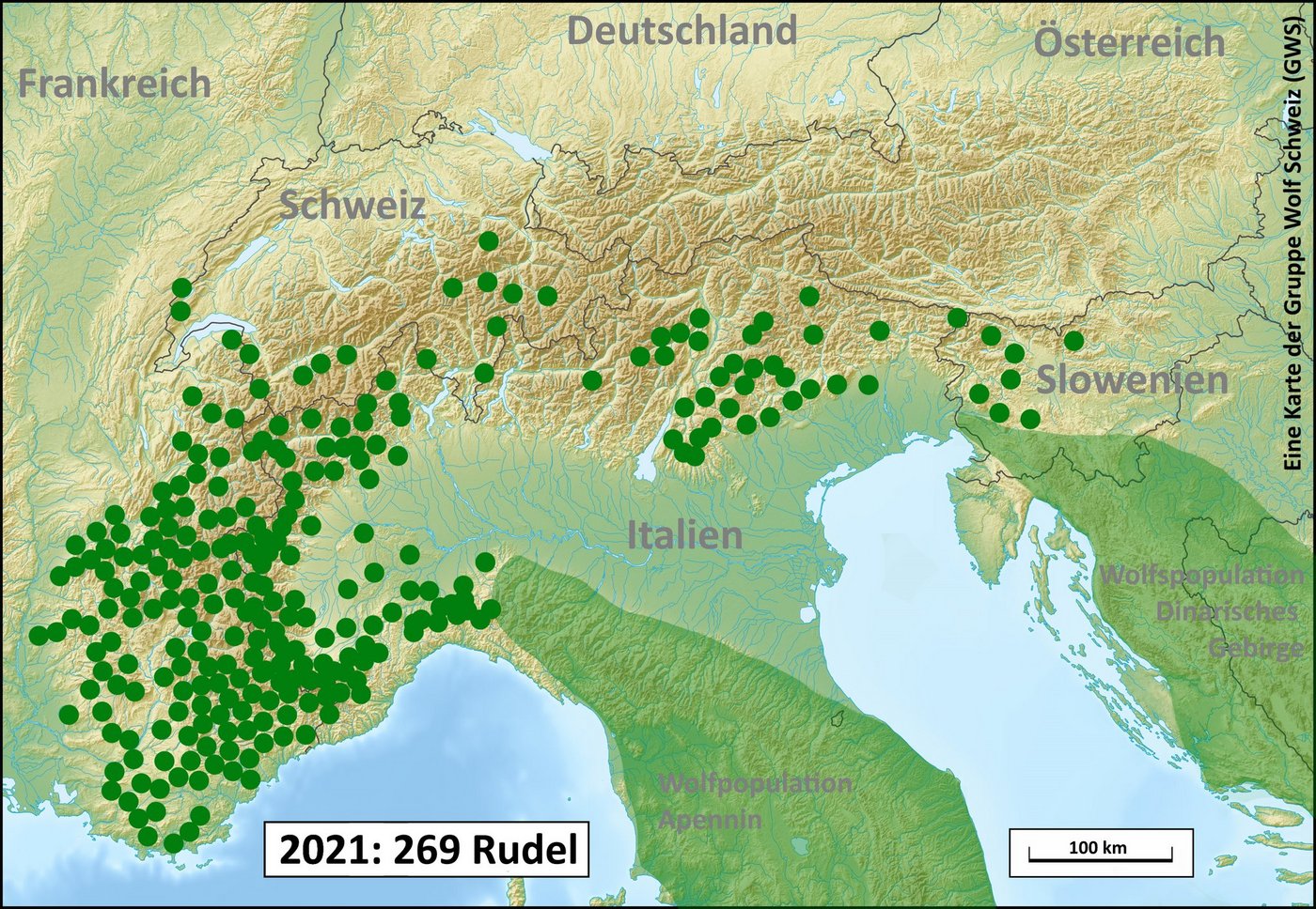 Aktuell leben laut GWS 269 Wolfrudel im rund 200'000 km2 grossen Alpenraum. Wissenschaftliche Studien würden rund die Hälfte davon als potentiellen Lebensraum für Wölfe identifizieren, wobei die Anpassungsfähigkeit der Grossraubtiere aber oft unterschätzt werde. Die aktuelle Verbreitung in den Westalpen zeige vielmehr, das «fast alle Gebiete der Alpen» besiedelt werden können.