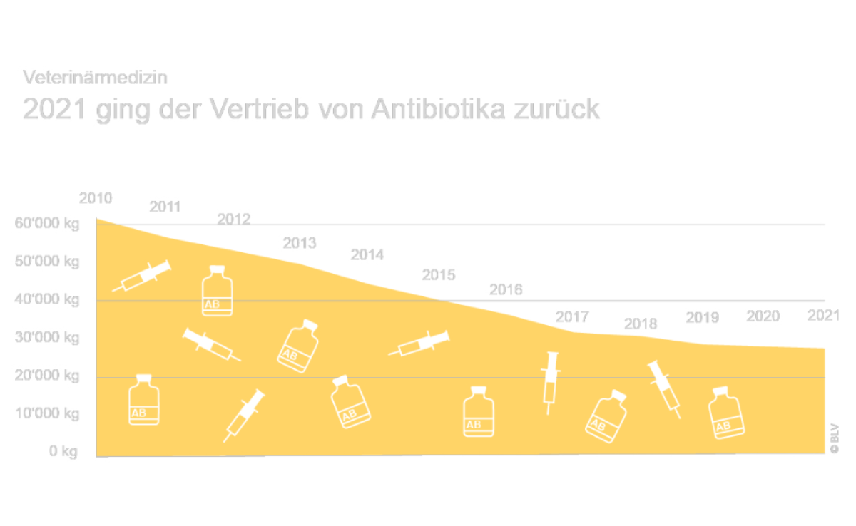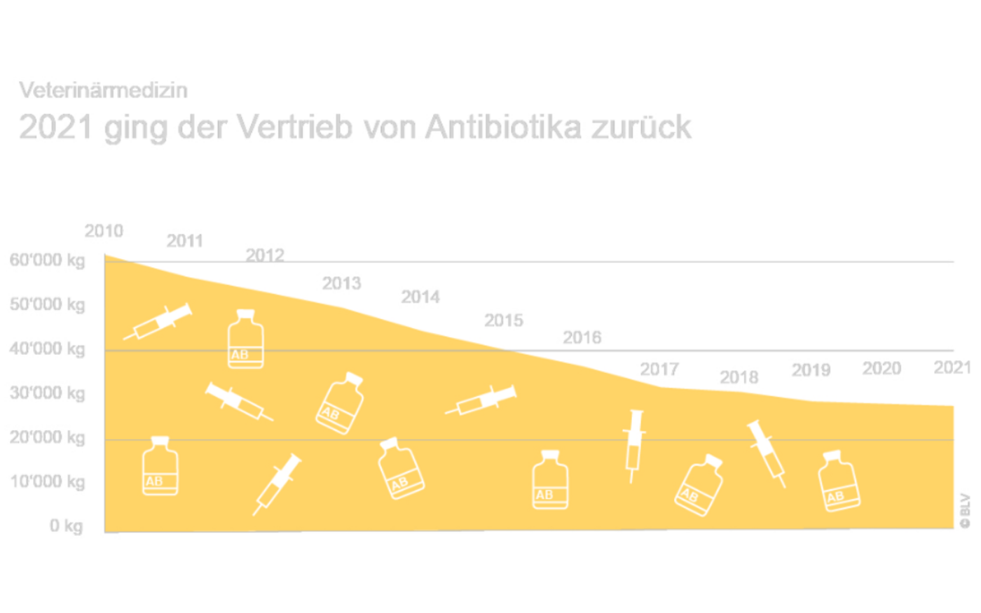 Die Vertriebsfirmen in der Schweiz geben immer weniger Antibiotika an die hiesigen Tierärzt(innen) ab, stellt das Bundesamt für Lebensmittelsicherheit und Veterinärwesen (BLV) fest. 2011 lag die Gesamtmenge verkaufter Wirkstoffe noch bei 60'000 kg, 2021 sank sie auf 28'000 kg, was einer Abnahme um 53 Prozent innert 10 Jahren entspricht. Im Vergleich zum Vorjahr sank der Wert über alle Wirkstoffklassen hinweg um 1,6, bei den kritischen Antibiotika um 7 Prozent. Das BLV interpretiert diese positive Entwicklung so, dass sowohl Tierärzte als auch Tierhalter(innen) stark auf das Thema Antibiotika sensibilisiert sind.