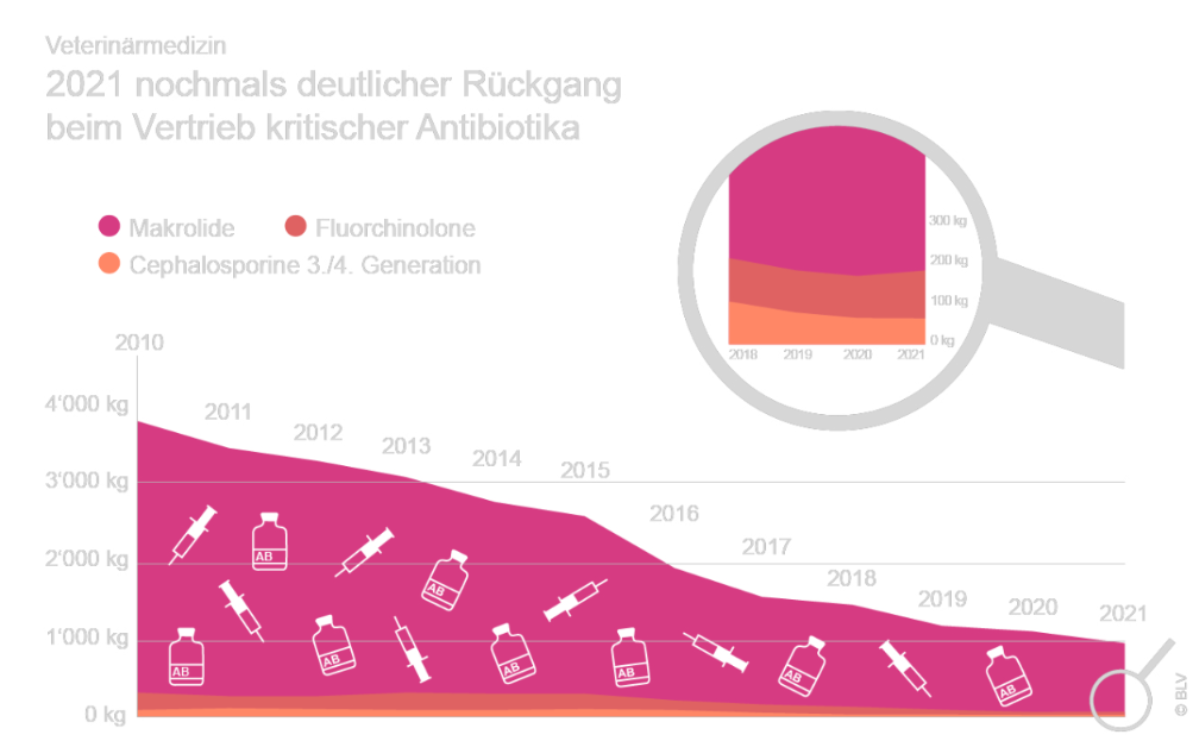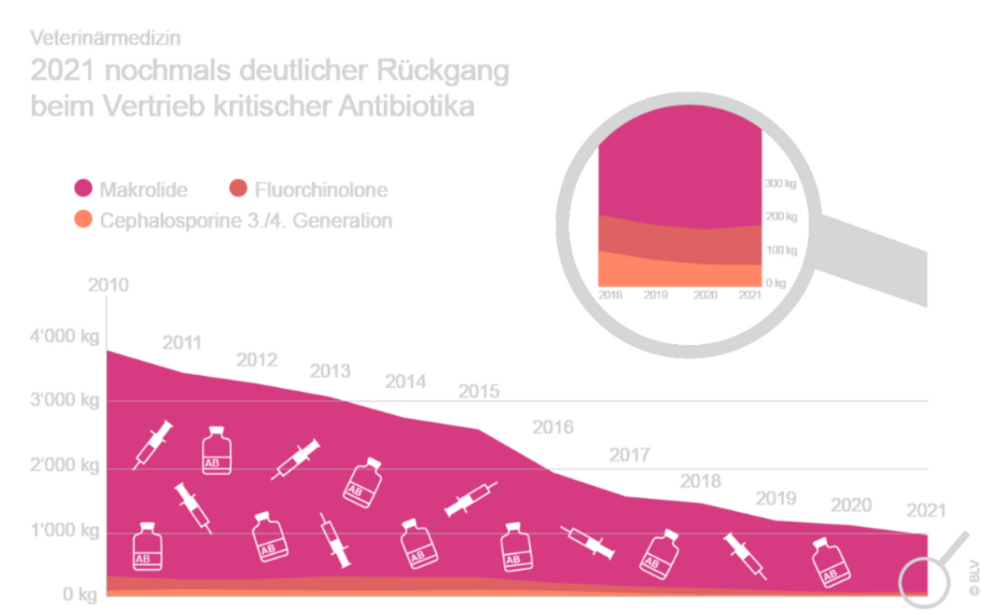 Im Zusammenhang mit Antibiotika sind insbesondere sich ausbildende und verbreitende Resistenzen ein Problem. Das BLV überwacht die Resistenzlage in der Schweiz mit regelmässigen Untersuchungen bei Schlachttieren. Diese zeigten bei Mastschweinen und -kälbern 2021 eine stabile Situation, die Resistenzen gegen wichtige Antibiotika seien sogar teilweise sinkend im Vergleich zum Vorjahr.