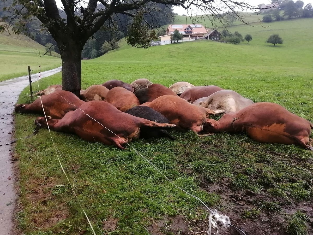 «Das Schlimmste habe ich wohl überstanden, zumindest den unmittelbaren Schock und die erste Trauer», berichtet Landwirt Peter Haldimann aus Bächlen bei Bowil BE am Telefon. Seine Stimme klingt ruhig und gefasst, obwohl er auf einen schweren Schlag angesprochen wird: In der Nacht vom 16. auf den 17. August hat ein ungewöhnlich starker Blitzeinschlag auf seiner Kuhweide 19 Tiere getötet. 19 Tiere verloren «Meine Herde…