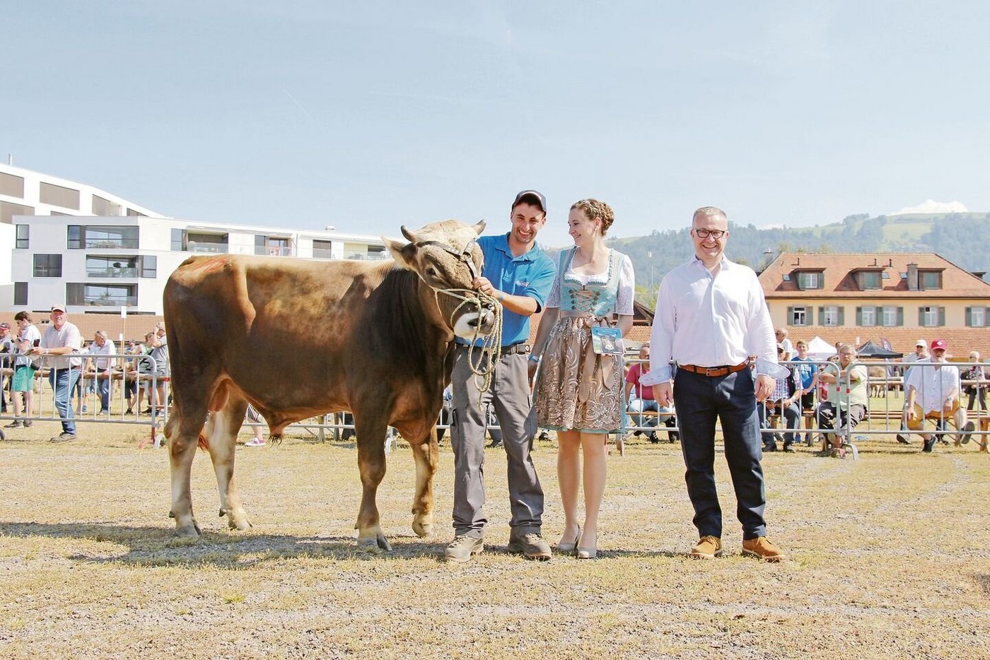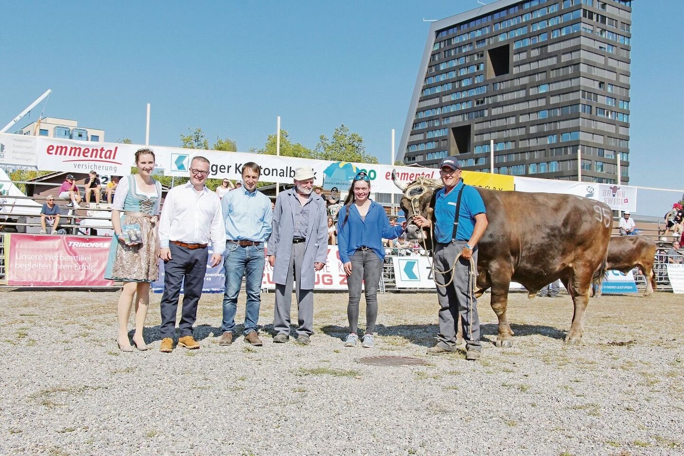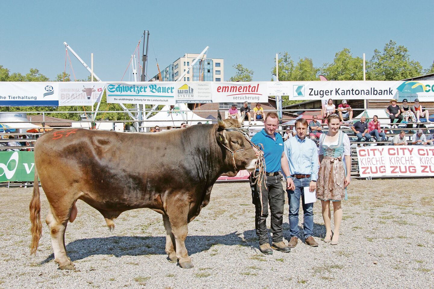 Zum Schluss wurde verkündet, dass 34 der am Zuchtstiermarkt Zug aufgeführten Stiere je eine Bronzemedaille und drei Stiere eine Silbermedaille gewonnen hätten. Gar drei Goldmedaillen gewann Eugen Hitz aus Trimbach im Kanton Solothurn für seinen Stier Gregi. Dieser OB-Stier ist schon allein mit seinem Gewicht von 1375 Kilogramm beeindruckend.