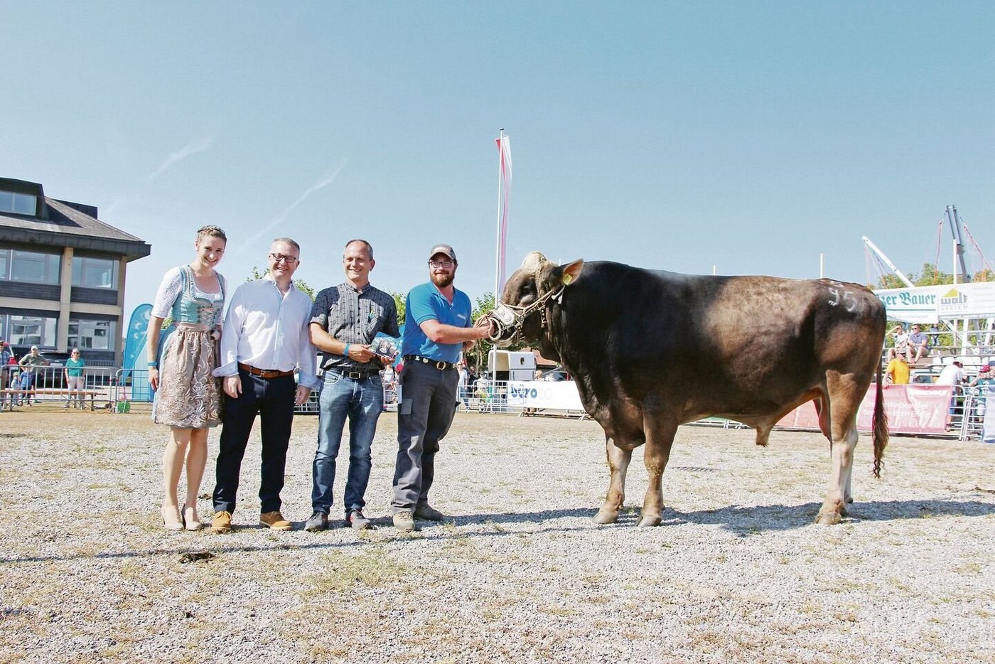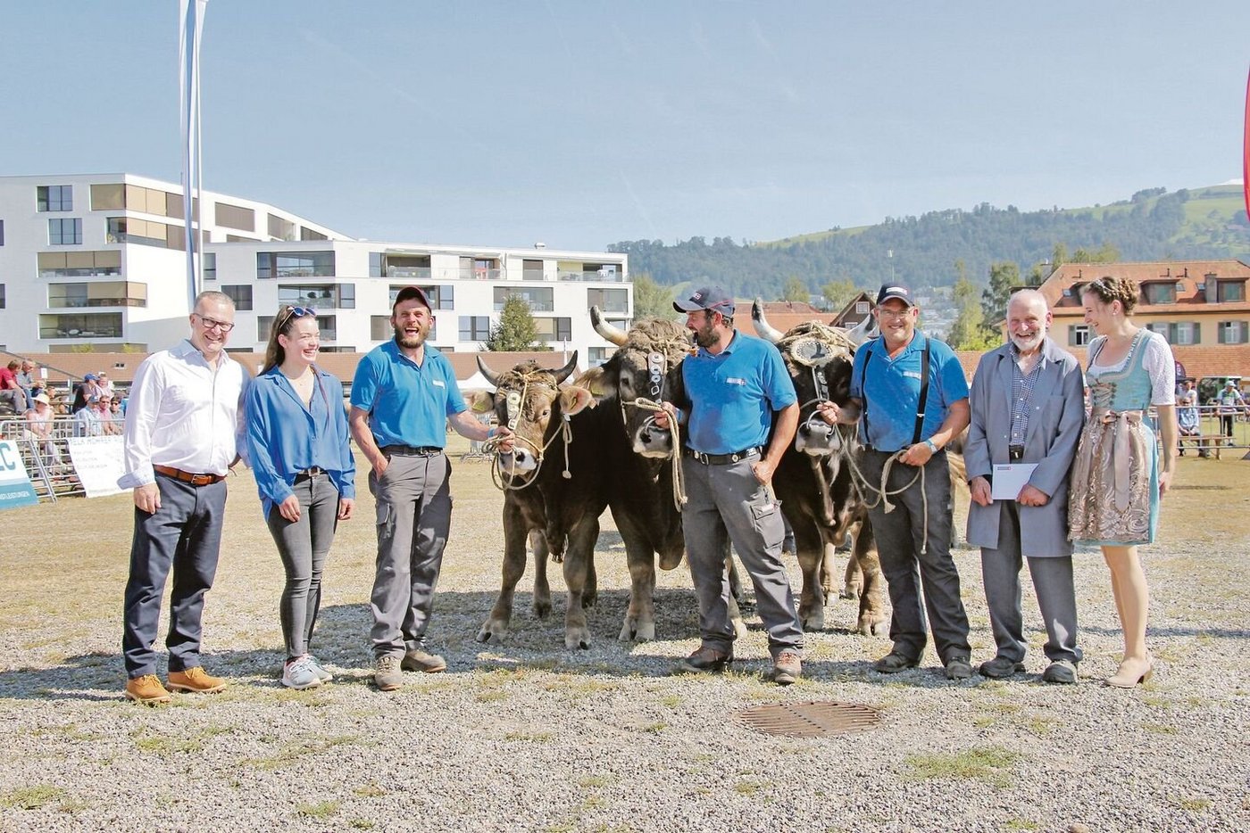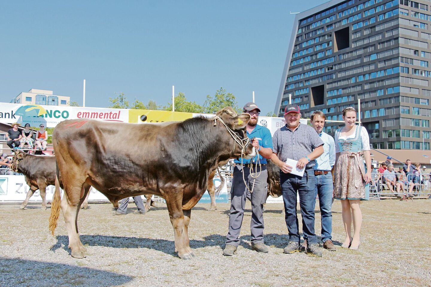 Zum Schluss wurde verkündet, dass 34 der am Zuchtstiermarkt Zug aufgeführten Stiere je eine Bronzemedaille und drei Stiere eine Silbermedaille gewonnen hätten. Gar drei Goldmedaillen gewann Eugen Hitz aus Trimbach im Kanton Solothurn für seinen Stier Gregi. Dieser OB-Stier ist schon allein mit seinem Gewicht von 1375 Kilogramm beeindruckend.