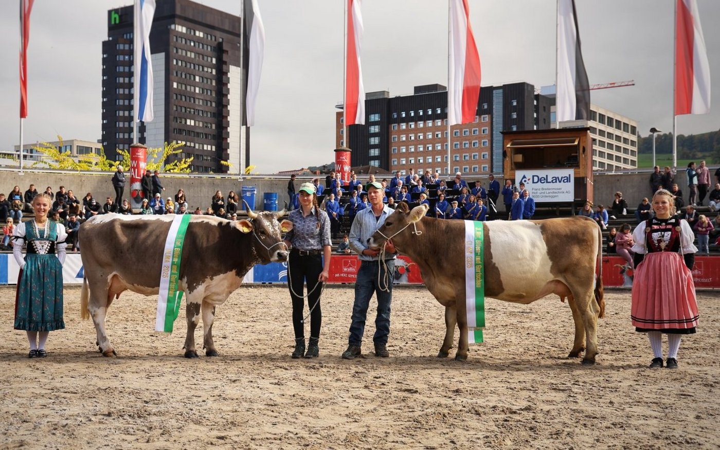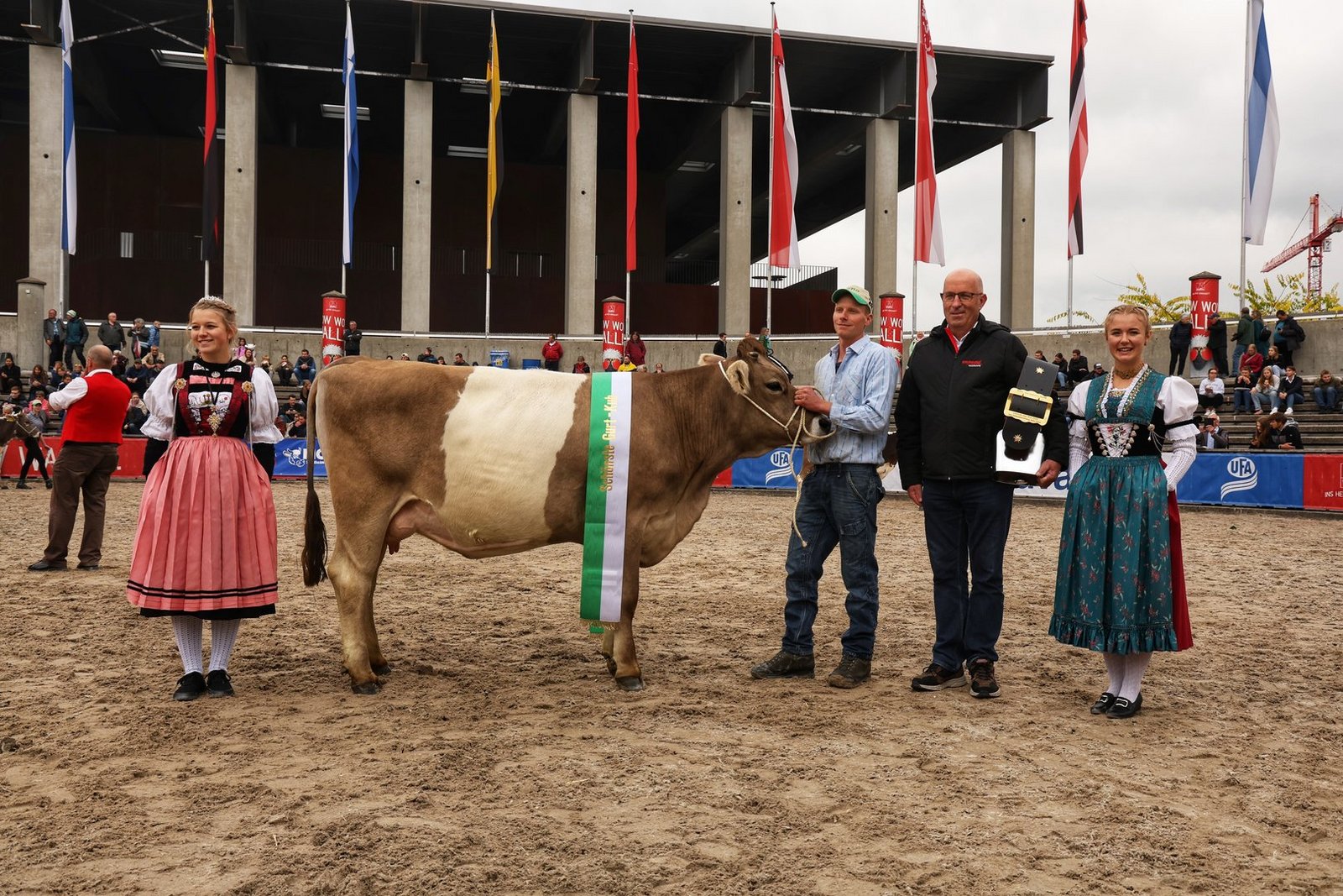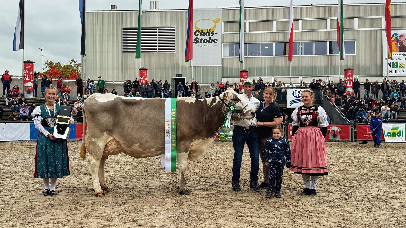 Ein schwieriger Entscheid für Matthias Süess also. Am Ende entscheidet er sich für eine hochgewachsene Brown Swiss – das Rennen macht Espania von Robert Röthlin aus Hauptwil TG, sie wird Tagessiegerin. «Sie präsentiert sich mit einem extrem langen, super verbundenen und fest beaderten Euter und zeigt sich gegenüber der Vize im Knochenbau und im Fundament eine Spur feiner», lobt Süess die Tagessiegerin. Robert Röthlin strahlt sichtlich stolz über seine Kuh, und sagt zur BauernZeitung: «Mein Vater hielt bereits Blüem im Stall, und ich züchte einfach weiter.»