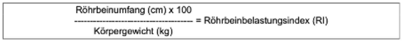 Seit diesem Jahr ist der Röhrbeinumfang ein Körungskriterium für Freiberger-Zuchthengste. Es gilt ein Minimum von 20 cm. Bei einem Gewicht von beispielsweise 550 kg ergibt das einen Röhrbeinbelastungsindex von 3,64 für ein Freiberger Pferd. Das ist eher tief, verglichen mit einem Shetlandpony (7,4) oder einem Englischen Vollblut (4,4). Die Tierärztliche Vereinigung für Tierschutz e.V. nennt 4,5 bis 6 als Hinweis auf eine «relativ höhere Belastbarkeit» im Vergleich zu grazilen Rassen wie Arabern. Unter unserem Freiberger-Rechenbeispiel rangiert z. B. das Süddeutsche Kaltblut (3,0).