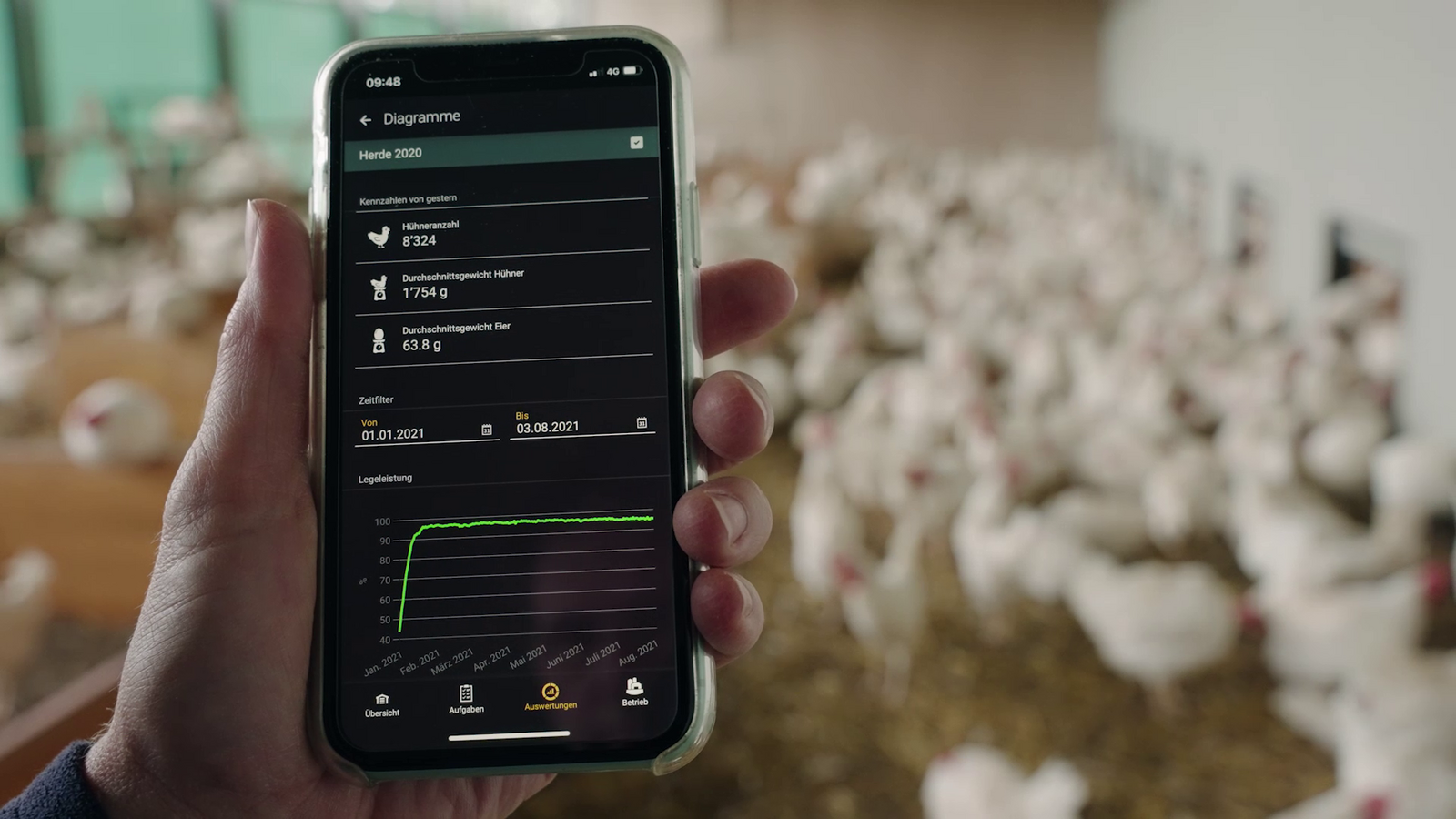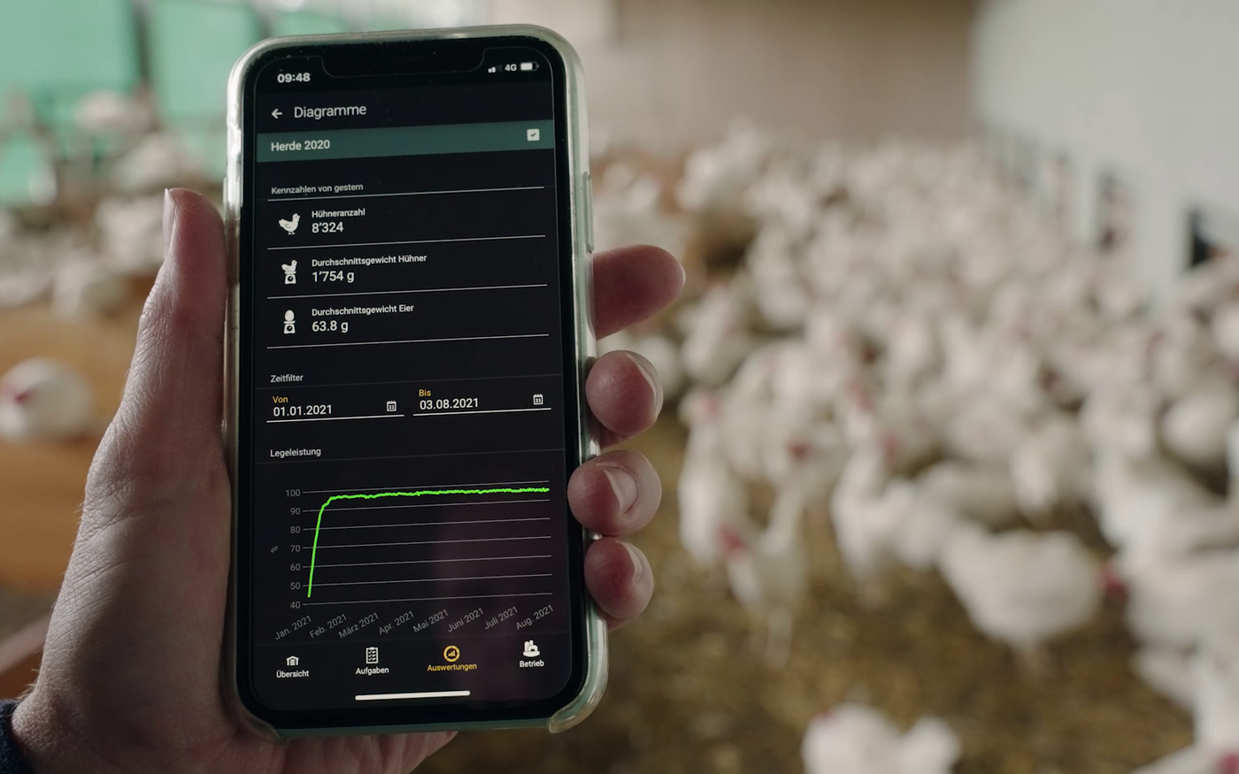 - Erfassen der täglich anfallenden Daten wie Legeleistung, Eigewicht, Tiergewicht, Wasser- und Futterverbrauch, Abgänge