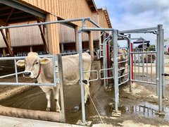 Da die Kühe viel unterwegs sind, seien die Weidewege zentral. Sie müssen in gutem Zustand sein, damit die Kühe problemlos zu den Weiden gelangen können. Über eine Strasse führt ein Viehübergang und bei den Wegen werden verschiedene Belags-Systeme ausprobiert: Holzschnitzel, Kies, Gummimatten sowie Spaltenbodenelemente mit und ohne Gummimate.