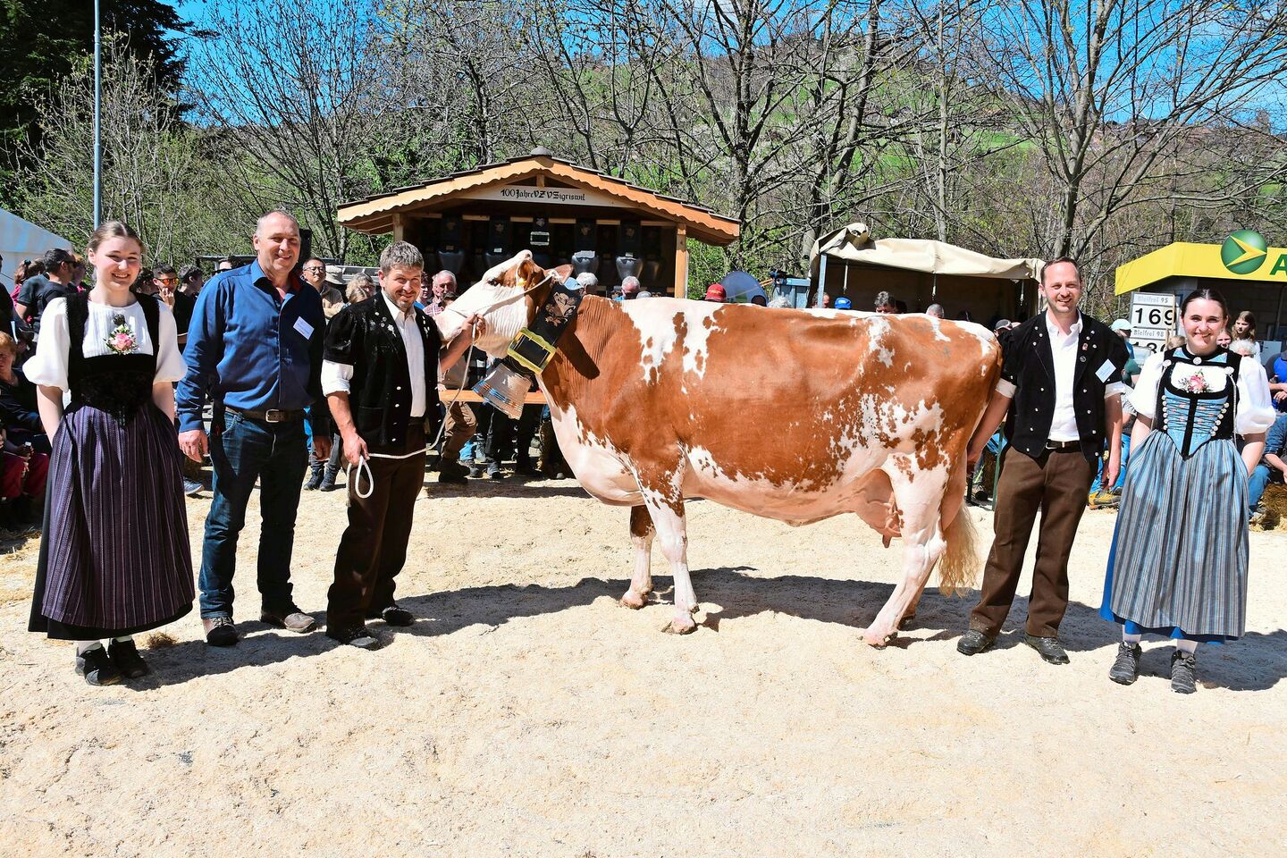 Ins Schwärmen kam auch Markus Gerber, Präsident von Swissherdbook, als er der Kuh Vinos Alpina von Erwin Zumbach aus Oberhofen die Glocke für die höchste Lebensleistung überreichen durfte. Die 12-jährige SF-Kuh Alpina ist mit 55 55 97 punktiert und hat bisher 78 288 kg Milch geleistet. Bei der Misswahl entschieden sich die Experten für die Siegerkuh in der Klasse 7: die eindrückliche Winetou Fabiola (55 55 98) von Erwin Zumbach aus Oberhofen. Den Titel der Junior-Siegerin konnte Kämpf’s Terry Valentina von Beat Kämpf aus Sigriswil für sich entscheiden. Der Schöneuterpreis ging an Windigen Swat Analisi (43 44 89) von Beat Sauser aus Sigriswil. Auch eine Rinder-Miss gab es zu bestimmen: Hier durfte sich am Schluss die Roxel-Tochter Alena aus dem Stall von Guido Bühler aus Sigriswil feiern lassen.