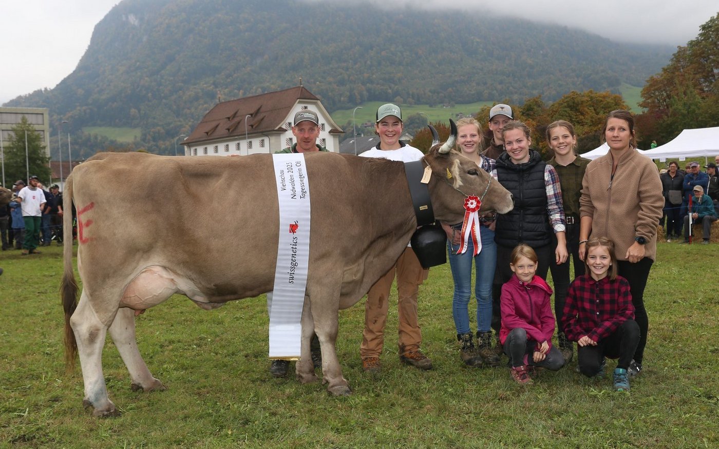 2021 hatte Familie Maya und Andreas Niederberger aus Buochs an der Nidwaldner Kantonalviehschau mit der Haegar-Tochter Hanna den Tagessieg errungen. Hanna präsentierte sich auch an der diesjährigen Austragung der Kantonalausstellung immer noch hervorragend und gewann die Abteilung der Kühe über 50 000 kg Lebensleistung. In der Wahl um den Tagessieg beim Brown Swiss musste sie sich aber hinter ihren jüngeren Konkurrentinnen anstellen. Dafür brillierte in diesem Wettbewerb ihre vier Jahre jüngere Vollschwester Hessa. Die enorm breite und feingliedrige Zweitmelkkuh wurde vom Schwyzer Experten Toni Dettling zur neuen Miss gekürt: «Ein Tier mit enorm viel Power», so Dettlings Kommentar.