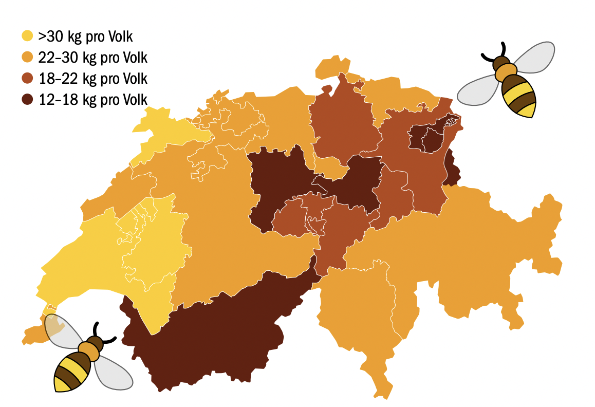 Das Tessin liegt im Mittelfeld, was im Vergleich zu früher eher ungewöhnlich ist. Diese Beobachtung korreliert mit den Hitzewellen, die im Westen ausgeprägter waren. Die Zentral- und Ostschweizer Kantone figurieren am Ende der Rangliste. Somit ergibt dies die im Bild dargestellte kantonale Verteilung der Gesamthonigmengen (Frühling und Sommer) in der Schweiz und im Fürstentum Liechtenstein.