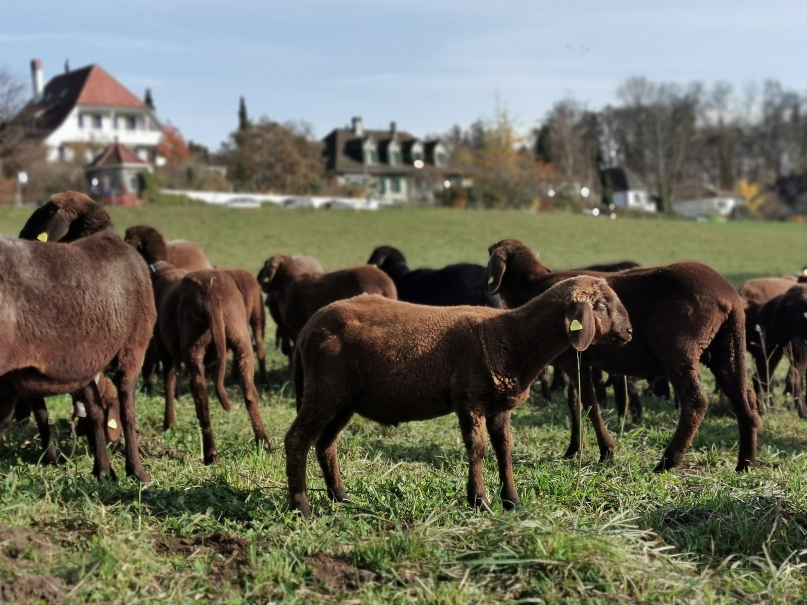 Es bimmelt idyllisch. Die Sonne scheint durch die alten Bäume auf die Wiese mit den weidenden Schafen. Es sind Engadinerschafe. Gut 150 Tiere sollen hier bis Mitte Dezember das Gras der rund 15 ha grossen Fläche abweiden. Zwischendurch ruft ein Junges nach seiner Mutter. Der Bus fährt vorbei. Er fährt von der Elfenau Richtung Hauptbahnhof Bern. Er stört die Idylle ein wenig. Denn was hier nach Bündner Alp aussieht, ist am Rande der Stadt Bern.