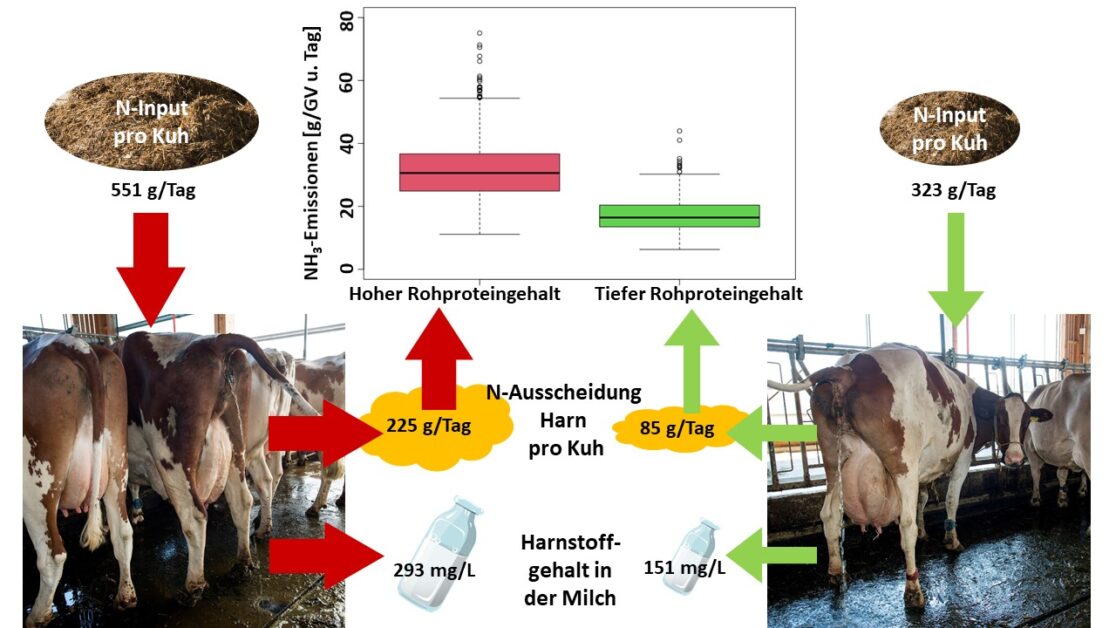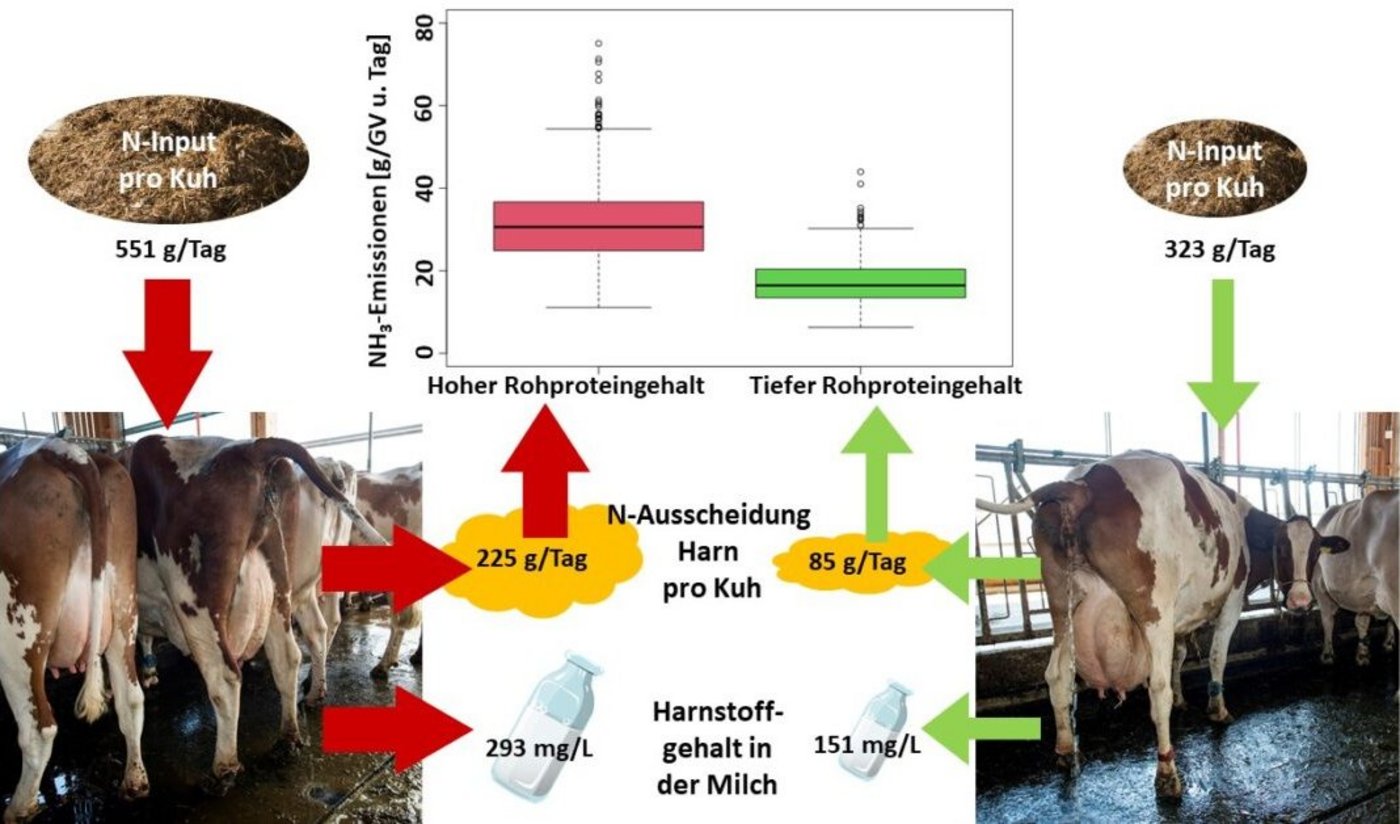 Unabhängig davon, ob sich die Emissionen auf das Tier, auf den Trockenmasseverzehr oder auf die energiekorrigierte Milchleistung bezogen, waren die Einflüsse der Ration, der Temperatur und der Windgeschwindigkeit im Stall auf die NH3-Emissionen hoch signifikant.» Darüber hinaus sei ein starker Zusammenhang zwischen dem Rohrproteingehalt der Ration, der Stickstoff-Ausscheidung im Harn und dem Harnstoffgehalt der Milch festgestellt. Diese Ausführungen sind ebenfalls der Medienmitteilung zu entnehmen.