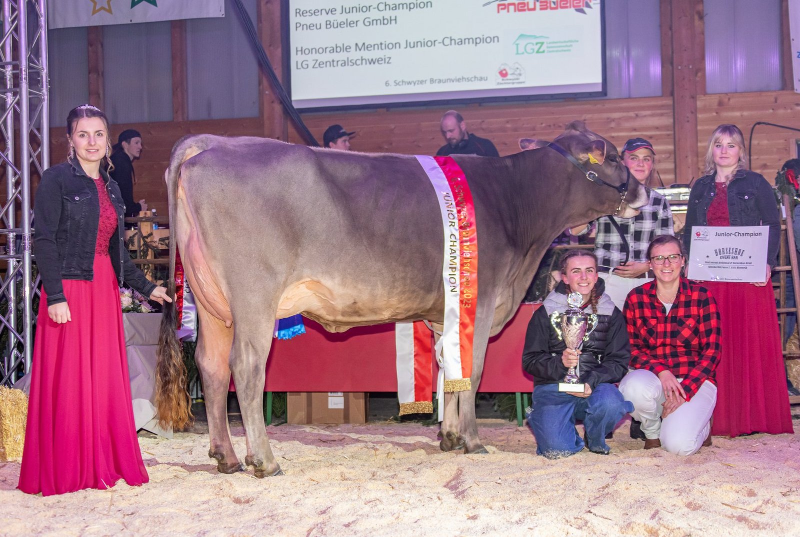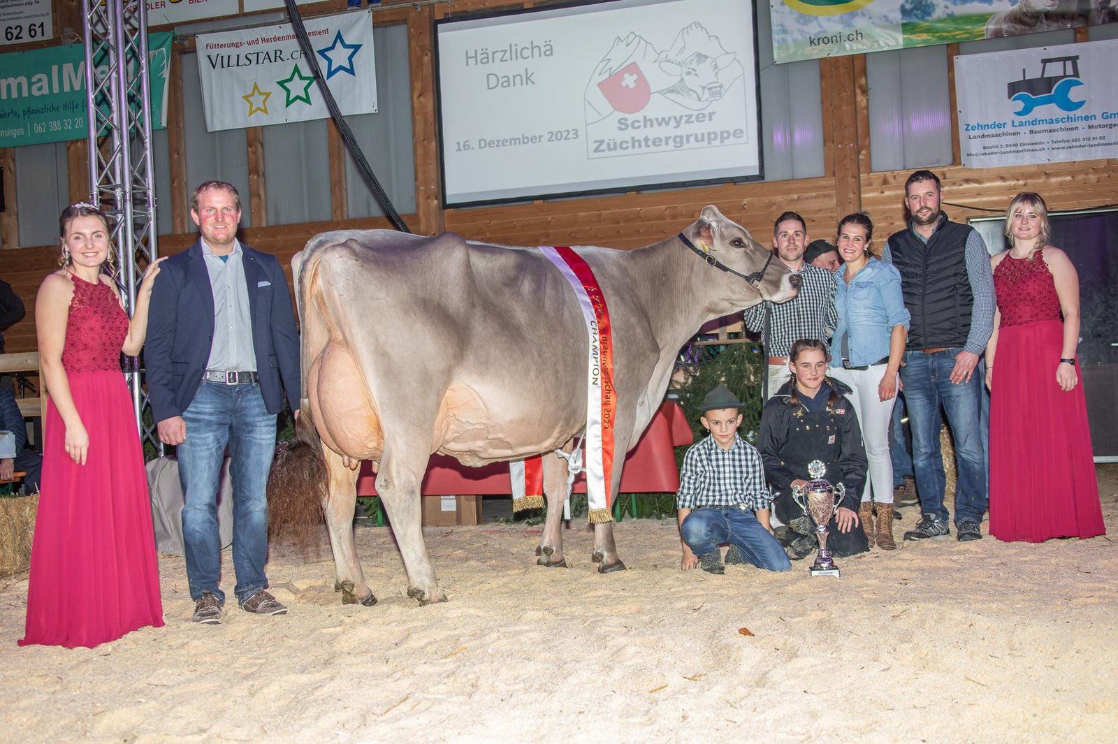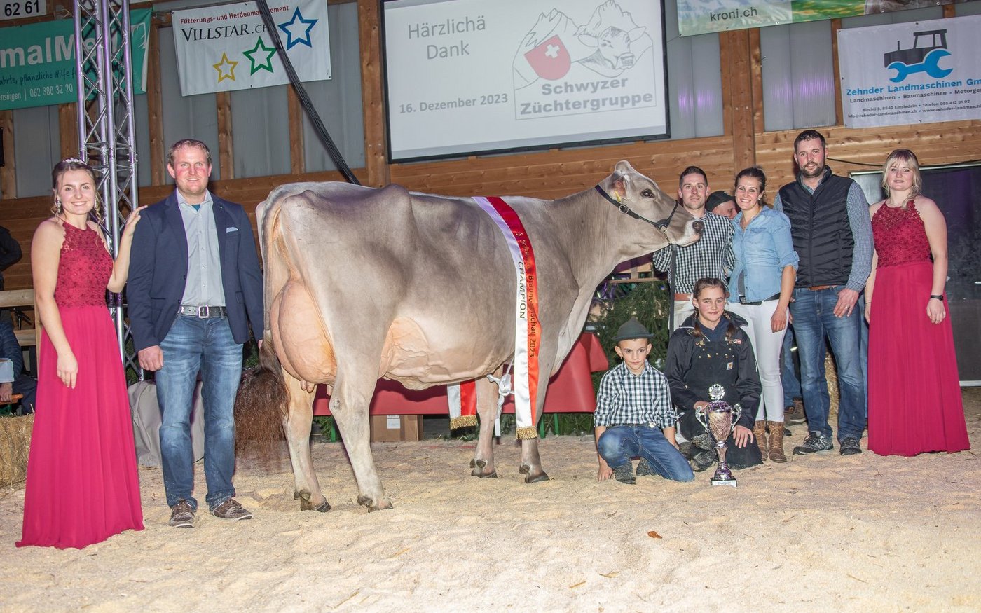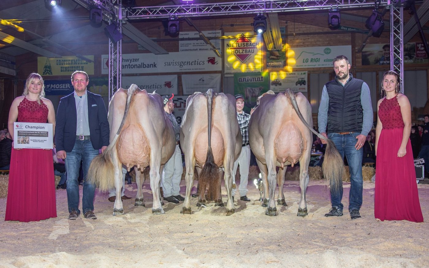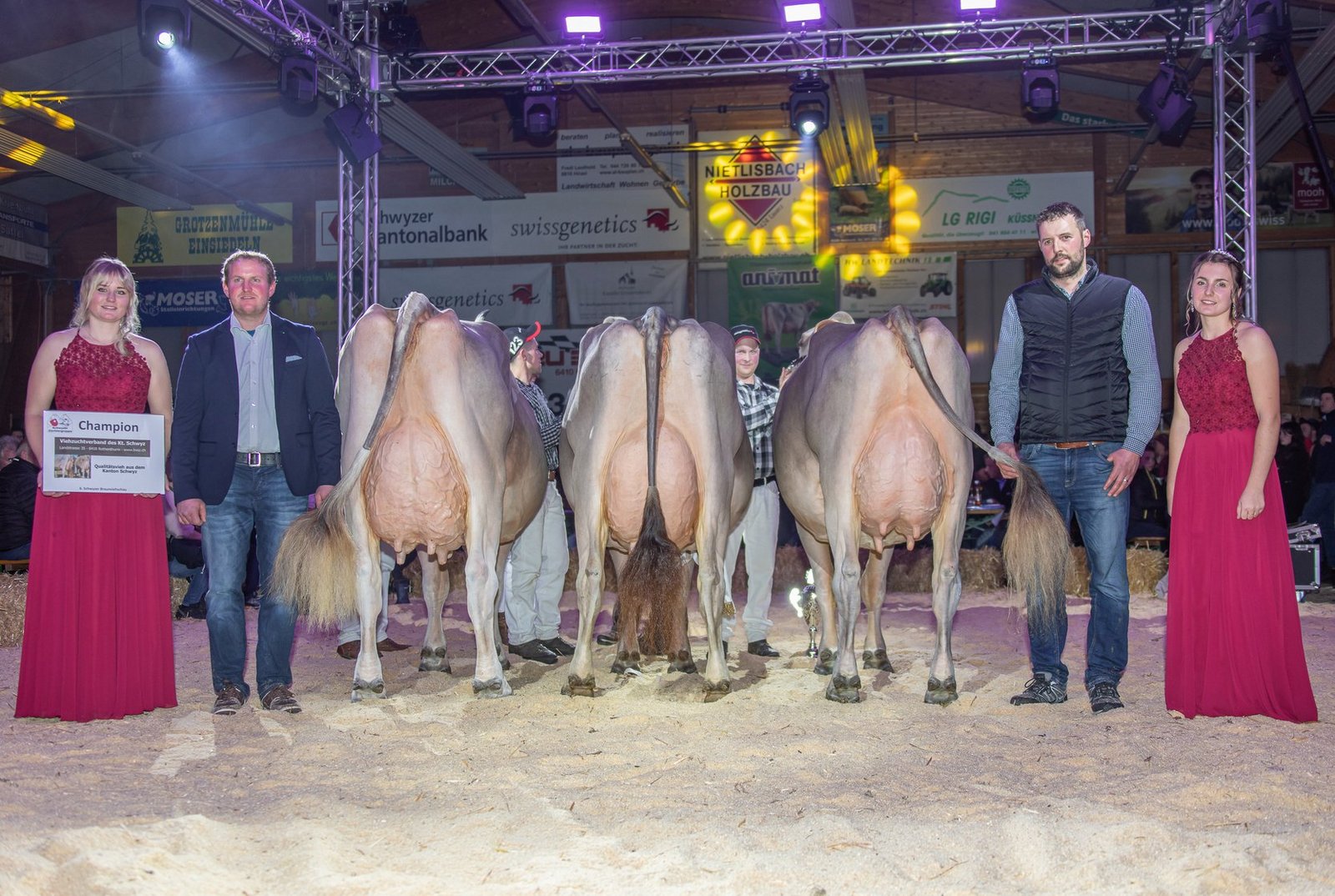 Rangliste Die mit Exzellent 96 eingestufte Jery Tochter Zara von Kevin Züger aus dem Vorderthal setzte sich an der 6. Schwyzer Braunviehschau durch. Die aktuelle Miss der Bezirksviehschau March und Abteilungssiegerin der Bruna 2022 wurden vom Urner Experten Toni Kempf zur Champion gekürt. [IMG 5] Drei Töchter von Glenny Gina auf dem Podest Auf den Ehrenplatz kam Plattenbach BS Glenwood Carola von der GG…