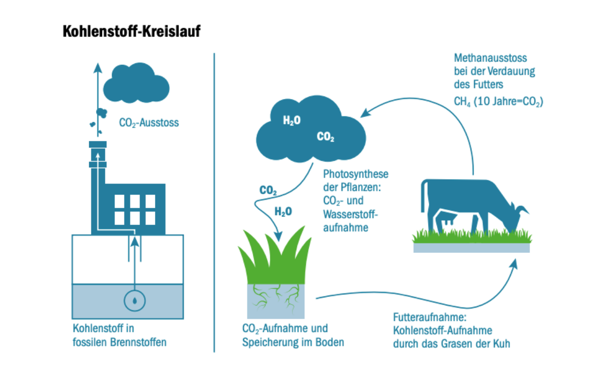 Leben ist im Grundsatz mit Kohlendioxid verbunden. In der Schweiz werden total 46 Millionen Tonnen CO2-eq pro Jahr emittiert und Schweizer Milchkühe sind für 3,8% der Treibhausgasemissionen verantwortlich. (BAFU 2021). Im Gegensatz zu den Emissionen in der Industrie und dem Verkehr sind die Emissionen einer Kuh Teil eines ökologischen Kreislaufes. Das ausgestossene Methan zersetzt sich bereits nach 10 Jahren in CO2 und gelangt so wieder in den Kreislauf.